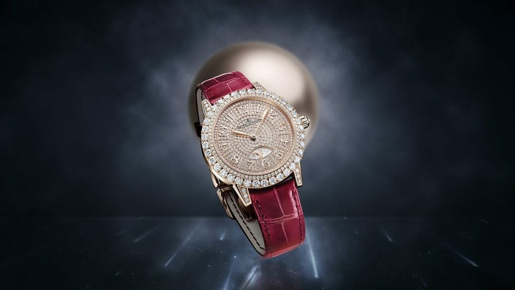 La nouvelle Rendez‑Vous Dazzling Night & Day se présente sur deux bracelets au choix, l’un en cuir d’alligator brillant dont le rouge éclatant contraste avec l’éclat des pierres, l’autre en or rose serti qui s’accorde harmonieusement au cadran. Tout d’abord imaginé pour la Rendez‑Vous Dazzling Shooting Star en 2022, le bracelet de Haute Joaillerie se compose d’une chaîne fluide dont les maillons en forme de losanges viennent naturellement épouser les formes du poignet, tel un ruban. À l’image du cadran, les maillons sont, eux aussi, ornés de 436 diamants sertis grains, représentant 80 heures de sertissage supplémentaires. Ainsi, la version Haute Joaillerie de la Rendez‑Vous Dazzling Night & Day arbore au total 1 026 diamants.