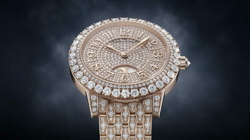 La collection Rendez‑Vous Dazzling, inaugurée en 2019, allie ce savoir-faire en Haute Horlogerie à la virtuosité joaillière de Jaeger‑LeCoultre. De cette union est née une lunette sertie de 108 diamants disposés en cercles concentriques, un style aéré et pourtant étincelant, dû au sertissage griffe du cercle extérieur tracé par 36 pierres. Pour compléter ce tableau chatoyant, la couronne est sertie d’un diamant inversé, tandis que trois diamants ornent chacune des quatre cornes.