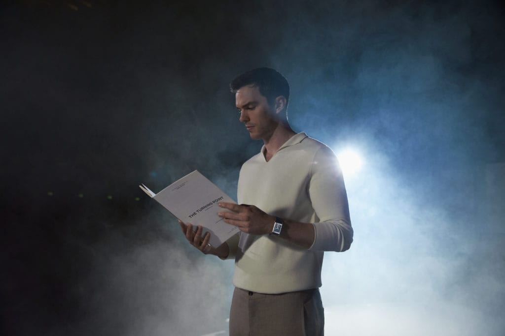 Le récit accompagne Nicholas tout au long d’une audition : le personnage est mis en scène dans des moments de concentration intense alors qu’il se prépare à monter sur scène, contrastant avec des phases d’introspection au cœur des forêts calmes de la Vallée de Joux. Alors que le court-métrage alterne entre les deux décors, l’acteur retourne la Reverso Tribute Duoface Tourbillon sur son poignet pour révéler sa deuxième face. Le deuxième fuseau horaire au verso évoque subtilement le sentiment d’avoir atteint un point décisif.