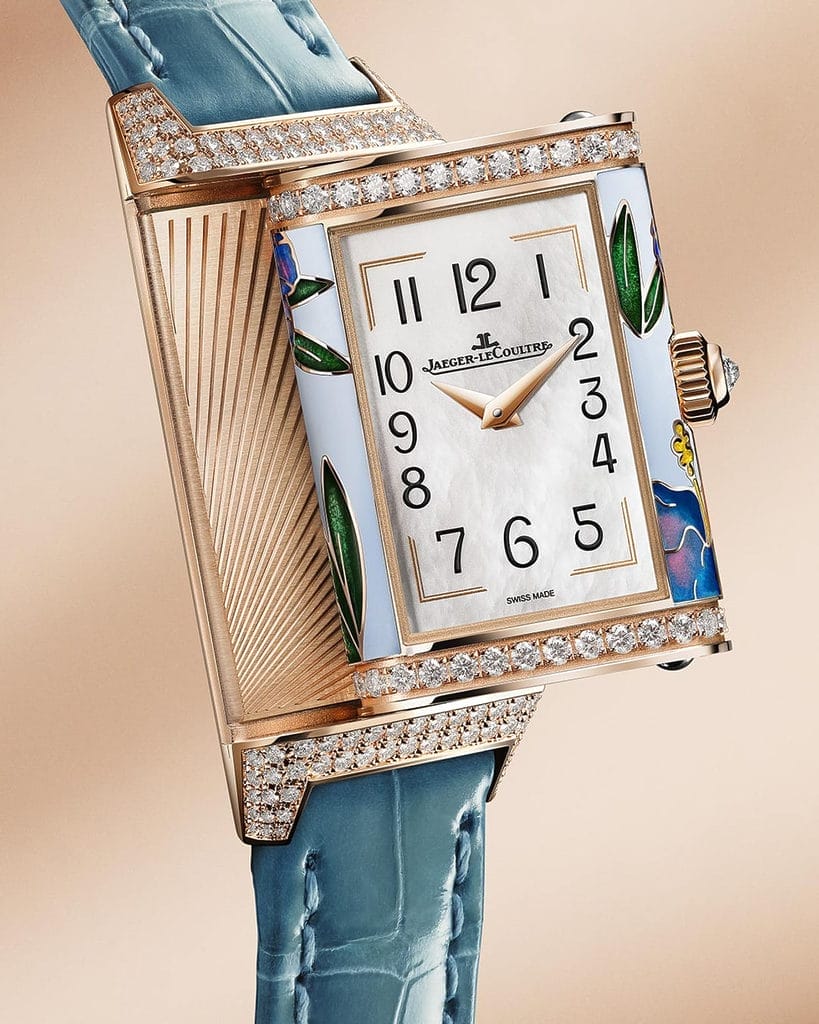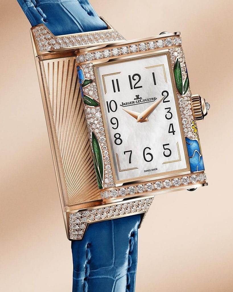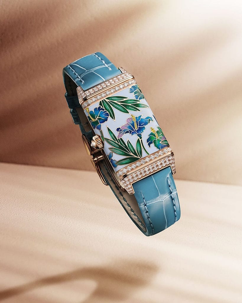 La pièce intitulée Hibiscus Enamel met à l’honneur la fleur tropicale par excellence, symbole de beauté et de sagesse, la réinterprétant dans des couleurs évoquant un lagon ensoleillé. Pour la première fois sur une Reverso One Métiers RaresTM, le fond est entièrement en émail Grand Feu, qui s’étire jusqu’aux profils convexes pour venir embrasser le cadran. Les délicates fleurs et feuilles du motif, réalisées grâce à la technique du champlevé, présentent des nuances insaisissables qui ont exigé 12 couleurs d’émail différentes, appliquées en neuf couches. Grâce à l’art délicat du paillonnage, les étamines dorées des hibiscus sont soulignées de minuscules paillettes d’or 24 carats, glissées sous l’émail. Les superbes nuances de bleu et de vert sont intensifiées par l’éclat des godrons et des cornes sertis de diamants – environ 157 pierres pour 1,25 carat. Au total, les 50 heures d’émaillage et les 22 heures de sertissage représentent 72 heures de travail rien que pour la décoration. La montre est assortie d’un bracelet en cuir d’alligator bleu brillant, teint spécialement dans les mêmes tons que les fleurs.
