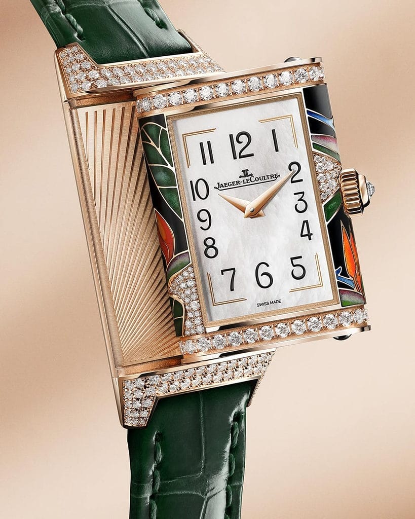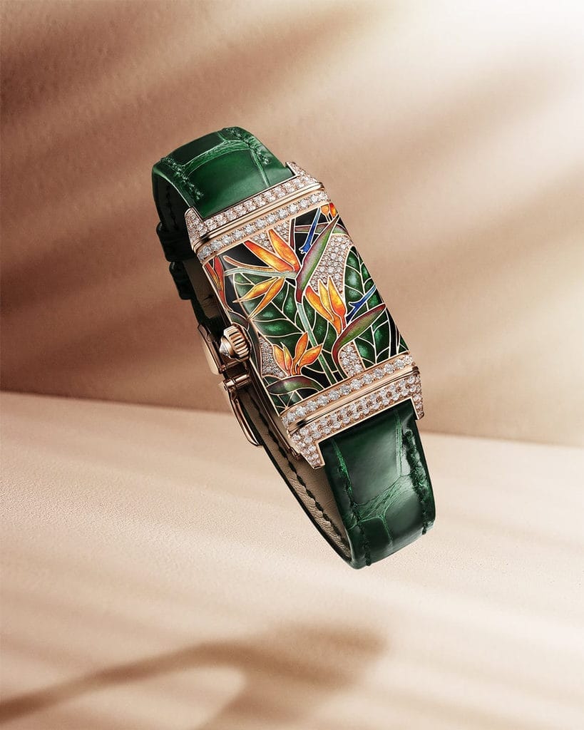 Jusqu’à neuf couches d’émail sont appliquées, exigeant 60 heures de travail. Les couleurs intenses des fleurs et des feuilles sont rehaussées par la brillance des diamants en serti neige qui composent le décor du motif. Technique complexe, le serti neige fait appel à des pierres de neuf tailles différentes. Le sertisseur doit sélectionner et placer les pierres à main levée afin qu’aucun millimètre de la surface en métal ne reste visible. L’objectif est de créer un scintillant tapis qui semble s’étendre à l’infini. La montre Birds of Paradise arbore un total d’environ 331 diamants pour 1,64 carat, soit 65 heures de sertissage. Elle repose sur un bracelet en cuir d’alligator vert brillant, teint spécialement dans le même ton que les feuilles. La Reverso One « Precious Flowers » Birds of Paradise représente un cumul de 125 heures de travail dans l’atelier des Métiers RaresTM.