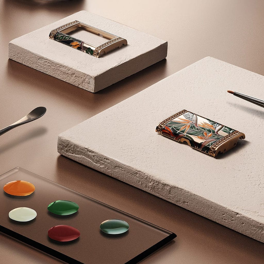 Le champlevé est l’une des techniques d’émaillage décoratif les plus anciennes. La surface plane de la boîte en métal est d’abord creusée pour dessiner la silhouette du motif final. L’émailleur peint ensuite les détails et les variations de ton du motif dans les sillons ainsi formés, couche après couche, associant habilement émaux transparents et opaques pour obtenir l’effet désiré. Processus lent qui exige de nombreux essais et tâtonnements en raison de la réaction imprévisible des pigments aux hautes températures, la recherche des couleurs a nécessité à elle seule plus de 50 heures, et ce avant même le début de la production.