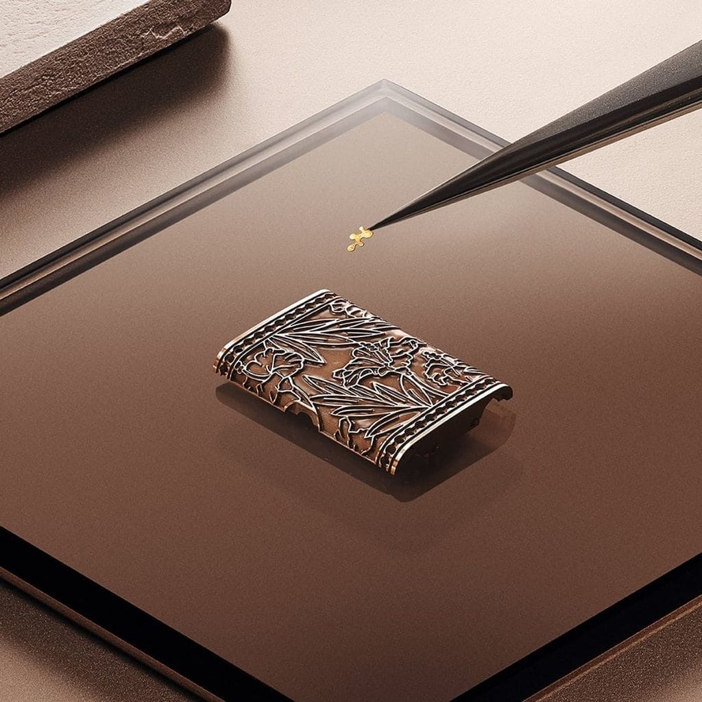 Ces nouvelles créations laissent libre cours aux savoir-faire et à l’expression artistique de l’atelier des Métiers RaresTM et de ses artisans, dont la collaboration a fait l’objet d’un processus savamment orchestré durant plusieurs semaines et plusieurs mois. Les motifs floraux se prolongent naturellement tout autour de la boîte, passant de manière ininterrompue du verso à l’avant de la pièce, épousant chaque courbe et chaque angle, ajoutant un haut degré de complexité au travail des artisans.