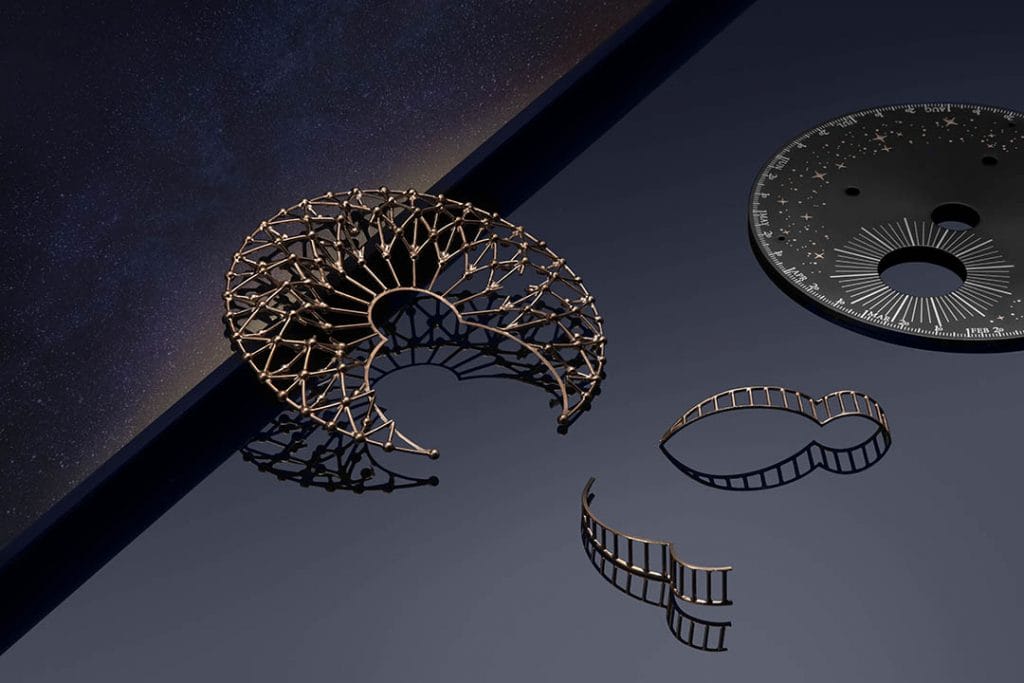 Fonctions : heures/minutes, mois, indicateur 24 heures, tourbillon volant orbital, répétition minutes avec timbres cathédrale « cristal » fixés sur le verre saphir, disque céleste avec voûte étoilée représentant les constellations de l’hémisphère Nord