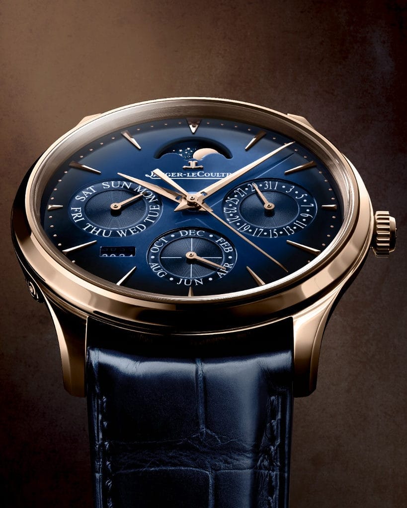 Jaeger-LeCoultre a pensé la Master Ultra Thin comme un concentré d’élégance horlogère. Destinée à l’esthète moderne, elle reflète à la fois sa maîtrise historique des calibres ultrafins et son désir d’allier virtuosité mécanique et beauté intemporelle. En 2024, la collection se réinvente et dévoile une nouvelle interprétation de la Master Ultra Thin Perpetual Calendar, associant une boîte et un cadran subtilement modernisés à une réserve de marche largement accrue. Quatre variantes sont proposées, dont une à cadran soleillé bleu nuit dégradé*.