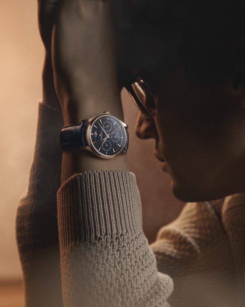 Si les dimensions de la boîte restent inchangées par rapport à la Master Ultra Thin Perpetual Calendar originelle – toujours aussi élégante avec ses 39 mm de diamètre et ses 9,2 mm d’épaisseur – son design a été discrètement actualisé, avec des proportions revues ainsi que des cornes étirées et amincies pour un confort accentué sur tous les poignets.