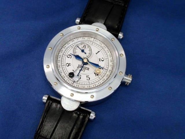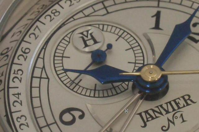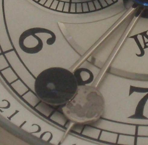 Une première aiguille, portant un disque en or blanc représentant la lune, indique le jour courant du cycle lunaire.