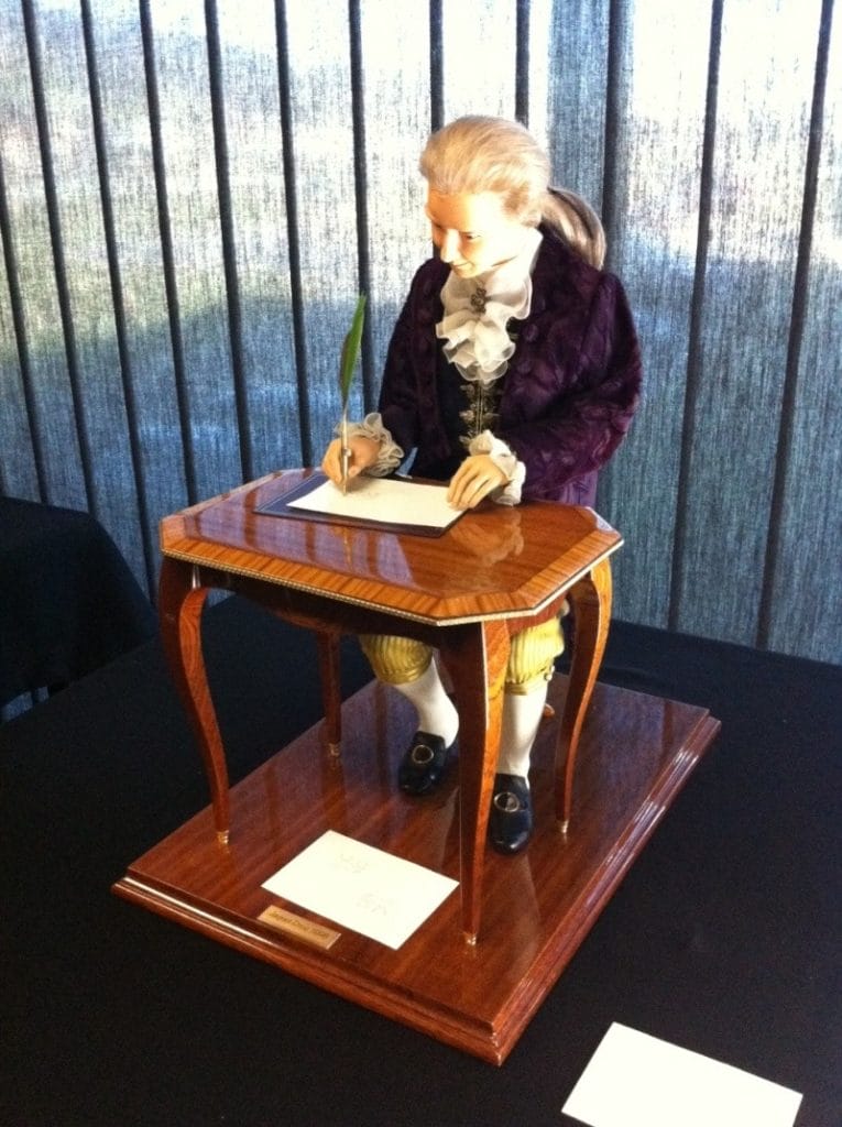 Après l’intervention de Madame Junier, une démonstration du fonctionnement de l’écrivain, dont le début de conception date de 1768, a été réalisée. Il nous a écrit un message… Ce message, par la suite, sera signé de Messieurs Hayek et Béguin pour s’ajouter à de nombreuses cartes conservées au musée de Neuchâtel depuis le retour de l’écrivain en 1909. S’ensuivit une série de questions / réponses :