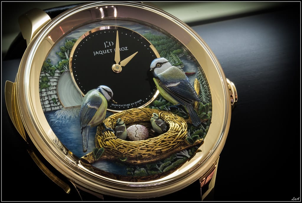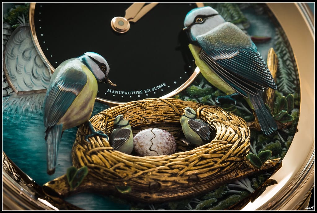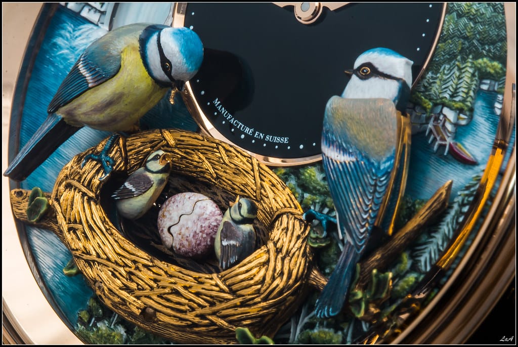 Vient alors le désir irrépressible d’actionner la gâchette présente sur le flanc gauche. Et l’émerveillement survient, tout comme les bouches bées et le silence de l’audience, qui contraste avec le tintement cristallin du timbre cathédral de la Répétition Minutes. Mais cet émerveillement est également dû au ballet minutieusement orchestré de ces mésanges, l’une se penchant au-dessus du nid pour donner la becquée, tandis que l’autre dévoile une partie de son aile aux multiples reflets, tout en inclinant la tête. Les oisillons ne sont pas inactifs pour autant, s’agitant dans le nid tandis que l’œuf se brise pour dévoiler le dernier rejeton. Le spectacle est de toute beauté, invitant le contemplateur à actionner une nouvelle fois la gâchette pour assister de nouveau à la représentation. Et là, surprise, l’animation n’est pas identique, et l’on nous apprendra qu’il existe en tout huit cadencements différents, ce qui achève de nous convaincre, s’il en était nécessaire, que le travail réalisé sur cette merveille est époustouflant.