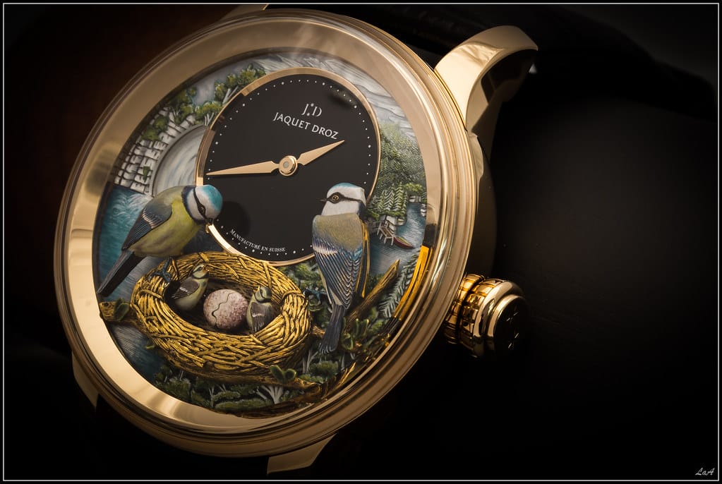 Nous voilà donc chaleureusement accueillis par Michel Salmont à la boutique Jaquet Droz dont il est responsable, rue de la Paix à Paris. Nous sommes invités à nous rendre au salon à l’étage, où la montre en question va nous être dévoilée. La voilà enfin, cette Bird Repeater, délicatement montée sur un support en bois creux faisant office de caisse d’amplification. Car si amplification il doit y avoir, cela veut dire que nous avons affaire à une montre à complication sonore. Et pas n’importe laquelle, une Répétition Minutes, l’une des complications les plus difficiles à réaliser. Mais cette montre ne se résume pas qu’à cela, même si l’on s’en serait volontiers contenté. Non, Jaquet Droz a voulu nous en offrir davantage, et c’est ici qu’intervient tout l’héritage de cette Belle Maison, pour nous présenter une parfaite synthèse de son histoire.