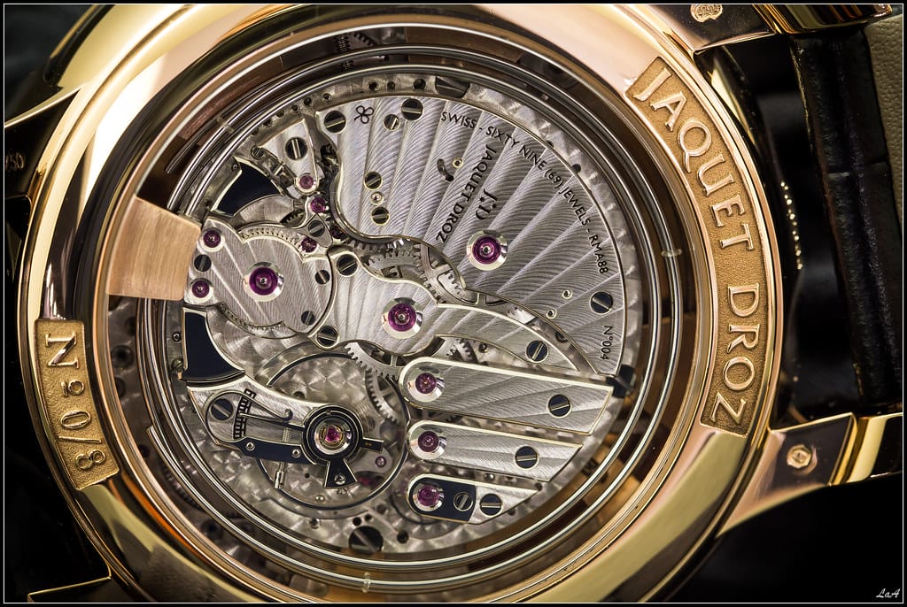 Son calibre Jaquet Droz Répétition Minutes, cadencé à 18000 alt/h est à remontage manuel et comporte un barillet unique lui permettant d’assurer 48 heures de réserve de marche.