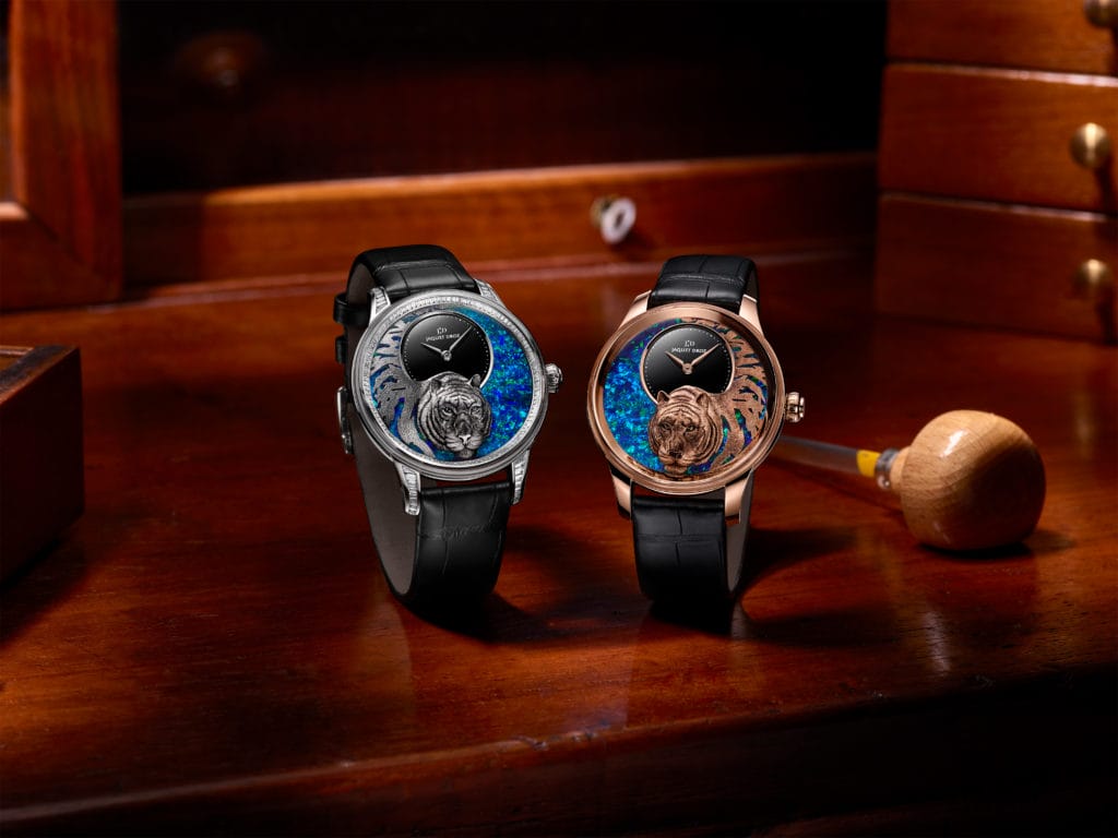 Plus exclusives, plus rares, plus précieuses. Trois caractéristiques qui décrivent les trois duos que Jaquet Droz dédie à la nouvelle année chinoise et au Tigre qui la représente. Dans chacune de ces compositions, l’animal mythique est offert suivant un profil, un art et une symbolique différente, exprimant la quintessence des Ateliers d’Art de la Maison, mais aussi leur histoire intime : depuis plus de deux siècles, la maison est réputée pour ses montres en duo. Elles furent développées notamment pour l’Empire de Chine où la maison fut, dès 1774, l’une des plus importantes maisons horlogères suisses localement représentée (600 pièces vendues en 10 ans, dont un grand nombre auprès de l’Empereur lui-même).