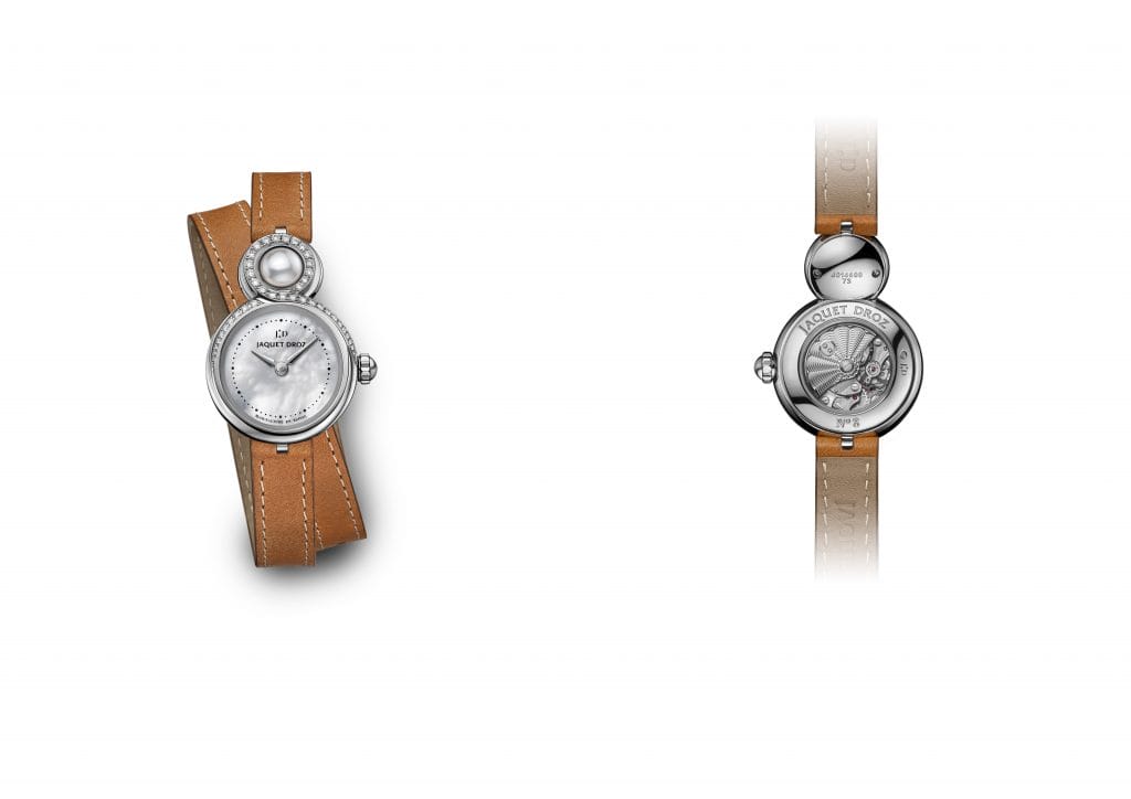A ses côtés, Jaquet Droz dévoile également une seconde variation tout aussi moderne de sa Lady 8 Petite, faisant cette fois la part belle à la nacre. La précieuse matière déploie ses reflets moirés sur son cadran, agrémenté d’un délicat chemin de fer marquant les heures et les minutes. A midi, la pièce comporte une authentique perle de nacre dont l’éclat se reflète dans les 41 diamants sertissant son boitier acier. Pour la première fois, Jaquet Droz dédie à sa Lady 8 Petite un bracelet double tour de couleur caramel, réalisé en veau. Sa surpiqure blanche rappelle l’éclat des diamants, conférant à cette version parée de nacre une orientation chic et moderne.