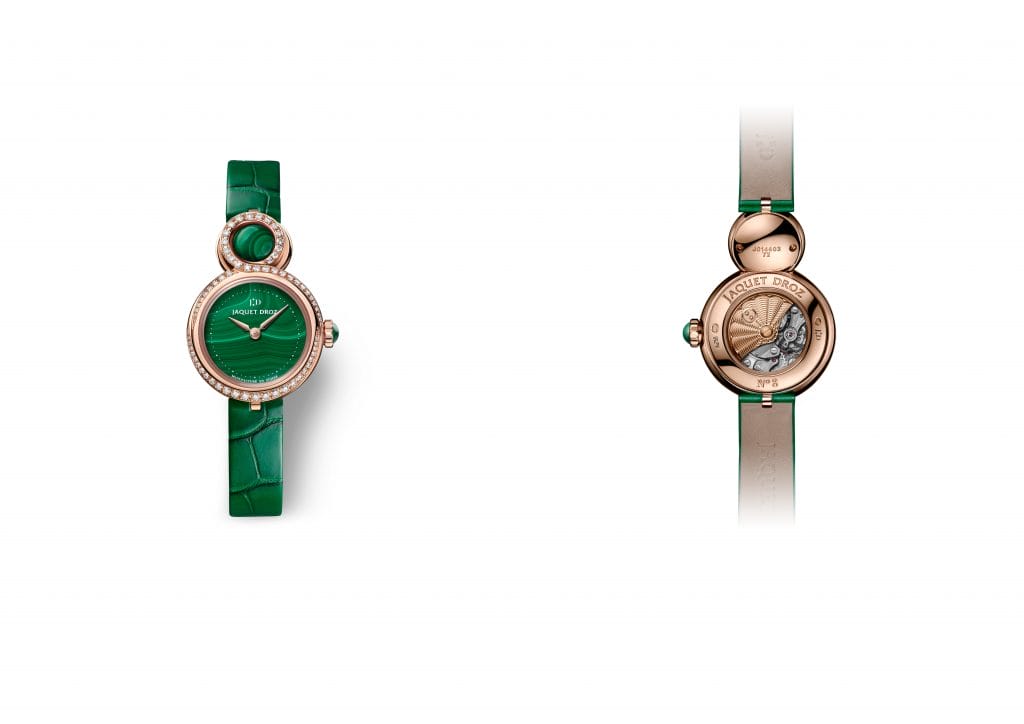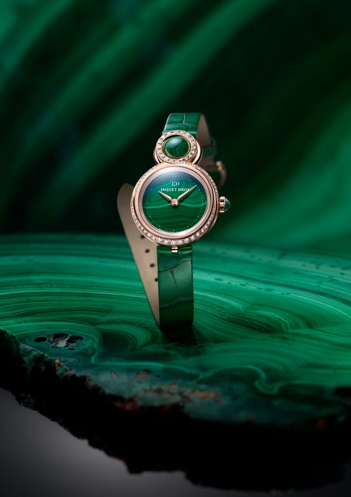La malachite et la nacre sont au cœur des deux variations que Jaquet Droz offre à sa Lady 8 Petite. A mi-chemin entre le talisman et le bijou, ces pièces éclairent la collection d’un jour nouveau alliant féminité et modernité.