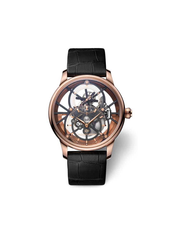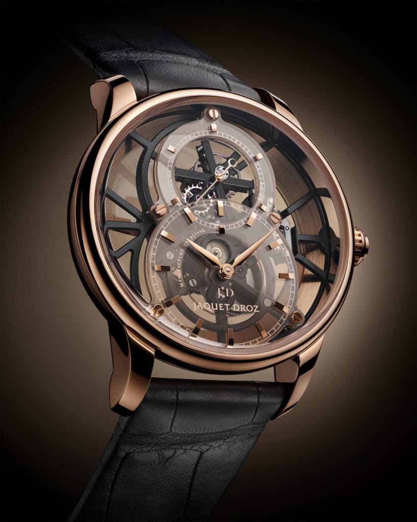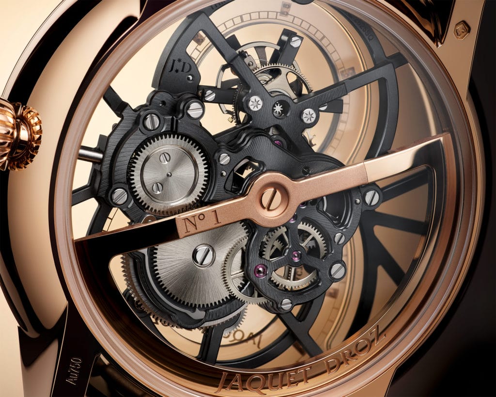 Jaquet Droz 2625SQ, mouvement tourbillon squelette à remontage automatique, traitement noir, spiral et cornes d’ancre en silicium, cage de tourbillon en titane, simple barillet, masse oscillante en or rouge 18 carats.