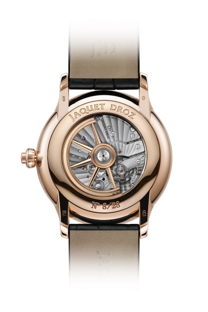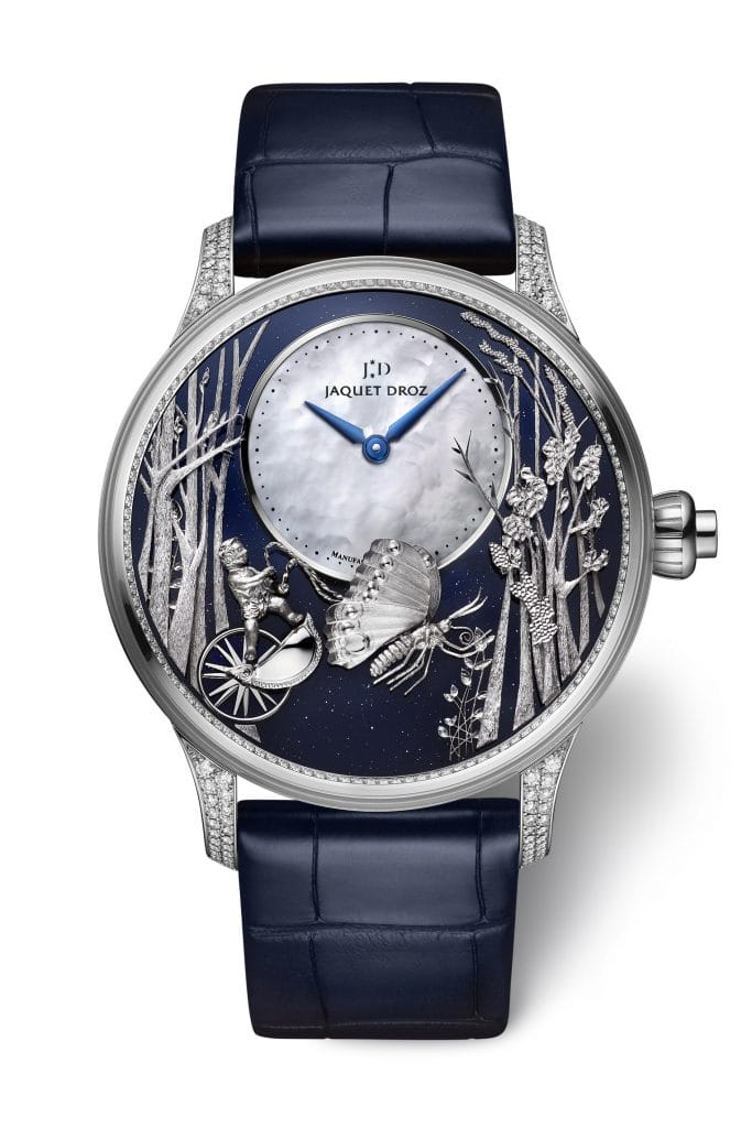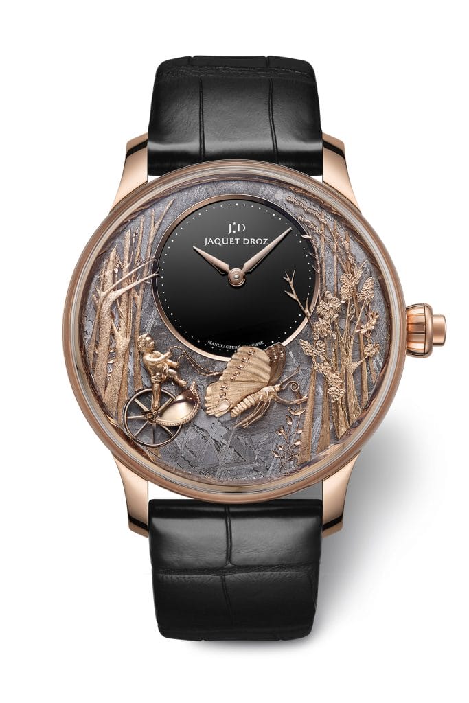 La version avec cadran météorite porte une composition animée en or rouge, partagé avec les aiguilles des heures et minutes qui se détachent d’un fond en onyx. Ces tons de gris, d’or et de noir donnent une profondeur nouvelle au tableau animé de Jaquet Droz. En son sein, un papillon bat des ailes pour entrainer derrière lui un chariot. Ses roues sont elles aussi en mouvement. L’angelot qui s’y tient debout rappelle Pierre Jaquet-Droz qui, comme lui, en son temps, s’est élancé à la découverte du monde.