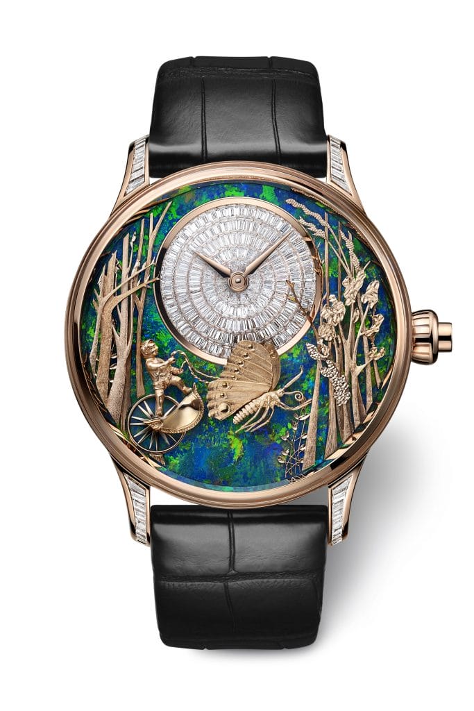 Leur incarnation est le fruit d’une minutie artisanale unique. Chaque élément en est réalisé à la main. L’épaisseur des arbres est de 0,2 mm. Sur chacun d’eux sont gravées une à une de fines nervures grâce à des outils conçus sur mesure pour cette tâche. Le papillon est constitué, comme le char, de plusieurs dizaines d’appliques fixes et mobiles ciselées par des artisans bijoutiers. L’ensemble prend place dans un véritable théâtre de nature dont le décor émerge littéralement de part et d’autre du cadran. Ses multiples niveaux lui confèrent une profondeur de champ inédite dans laquelle le regard flâne, s’égare, se perd, se promène. Un réalisme saisissant prend forme, foisonnant de détails qui donnent vie à ce décor flamboyant.