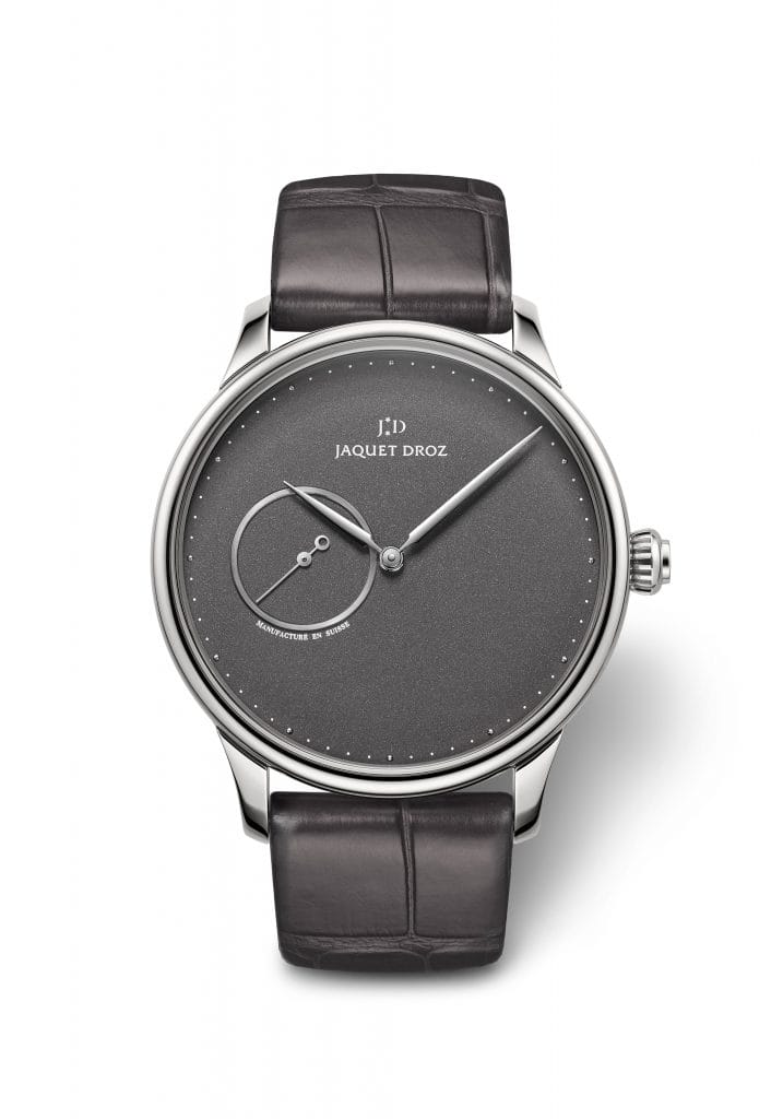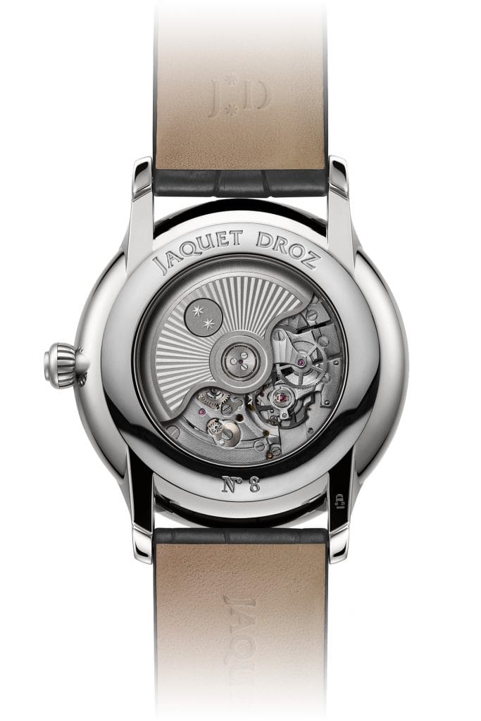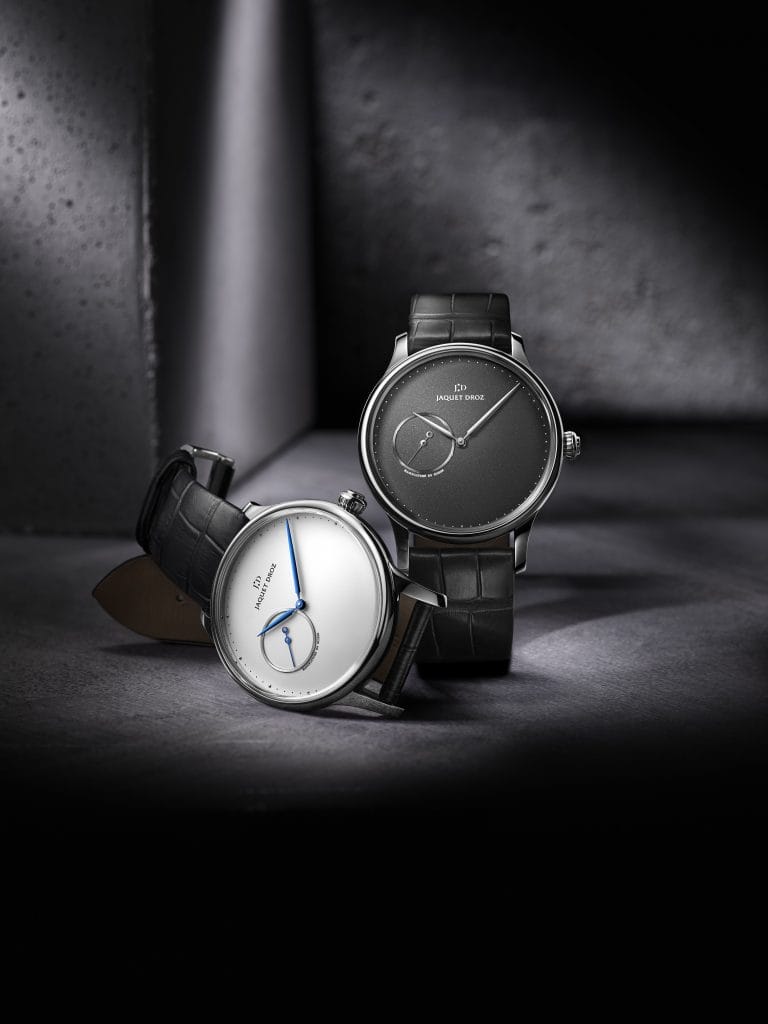 Les deux pièces se distinguent par leur pureté. Seules figurent sur leur cadran les informations essentielles : heures, minutes, secondes. Une discrète minuterie vient simplement en égrener l’écoulement. Jaquet Droz démontre ici sa maîtrise des plus infimes détails, avec l’ajout sur cette dernière d’un délicat clou rhodié toutes les cinq minutes, afin de lui apporter un relief à peine perceptible. Le rehaut est d’ailleurs lui aussi rhodié afin de donner à cette minuterie un subtile éclat argenté. Cette composition astrale est complétée à 9h de l’une des signatures de la maison : la seconde décentrée. Terminée par un cercle lui-même décentré, son aiguille rappelle subtilement la révolution d’un astre, en référence à la collection éponyme de la maison.