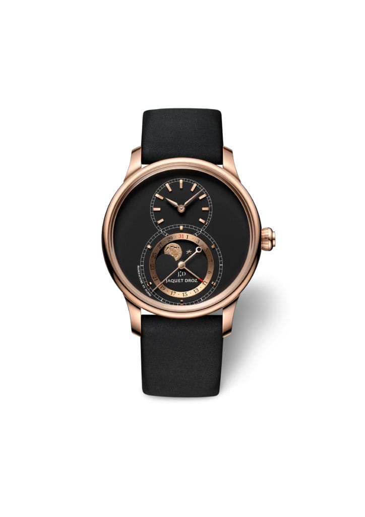La seconde pièce offre quant à elle un cadran noir mat, une variation d’une sombre intensité astrale d’où se détache avec grâce la phase de Lune. Pour la première fois, la pièce se départit de ses chiffres arabes comme romains pour ses indication heures-minutes. Ils s’effacent ici au seul profit d’index en or rouge, ce qui confère à la pièce un style plus contemporain, plus structuré et épuré. Cette modernité est renfoncée par un bracelet mat en veau noir rembordé main. Avec une approche très contemporaine, Jaquet Droz a ainsi dessiné une nouvelle Grande Seconde Moon à seulement deux tons, où l’éclat de l’or rouge n’a d’égal que la profondeur du noir intense.