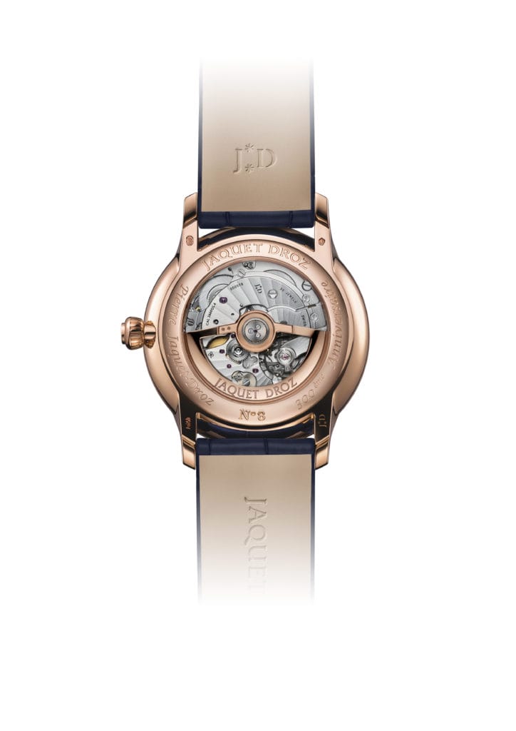 Chaque variation est gravée à la main « Pierre Jaquet-Droz, 300ème Anniversaire » au dos, où le fond saphir laisse apparaître une masse oscillante en or rouge, tournant au rythme d’un temps que Jaquet Droz décompte depuis près de trois siècles.