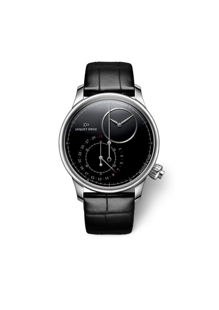 La Grande Seconde Décentrée Chronographe est pour la première fois dotée d’un cadran en onyx. Une livrée minérale unique, profonde, naturelle, dont se détache avec subtilité la délicate composition dessinée par Jaquet Droz.
