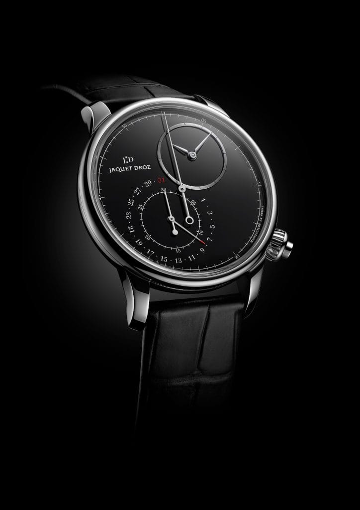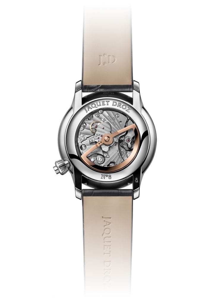 Ce ballet mécanique est agencé selon la chorégraphie « décentrée » chère à Jaquet Droz, où la date rétrograde se situe à 7h. En son sein se love le compteur 30 minutes du chronographe. Le calibre Jaquet Droz 26M5R, chronographe monopoussoir automatique à roue à colonne, anime l’ensemble et se dévoile par un fond saphir. Le regard averti ne manquera pas d’y noter la masse oscillante ajourée en or rouge, ne masquant rien des Cotes de Genève appliquées à chaque pont. Des finitions traditionnelles de Haute Horlogerie qui s’allient aujourd’hui aux technologies de pointe comme l’échappement en silicium, garant d’une précision accrue, insensible au magnétisme comme aux variations de températures.