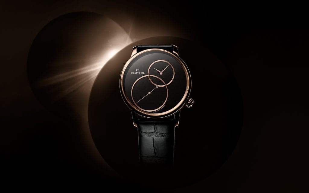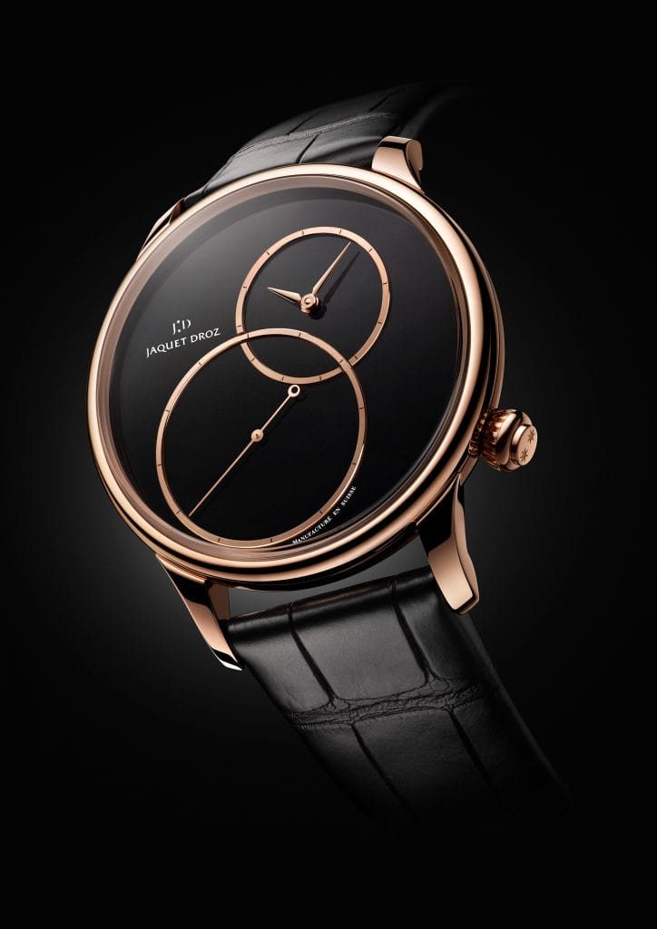On y reconnaît le dessin de la Grande Seconde, créée par Pierre Jaquet-Droz il y a près de trois siècles. Pourtant, ce dessin s’autorise ici une digression maîtrisée, une différence assumée : l’heure est décentrée. L’alignement des heures et minutes avec la grande seconde indépendante est respecté mais suivant un axe légèrement de biais, de 1h à 7h. Nouveau siècle, nouvelle audace.