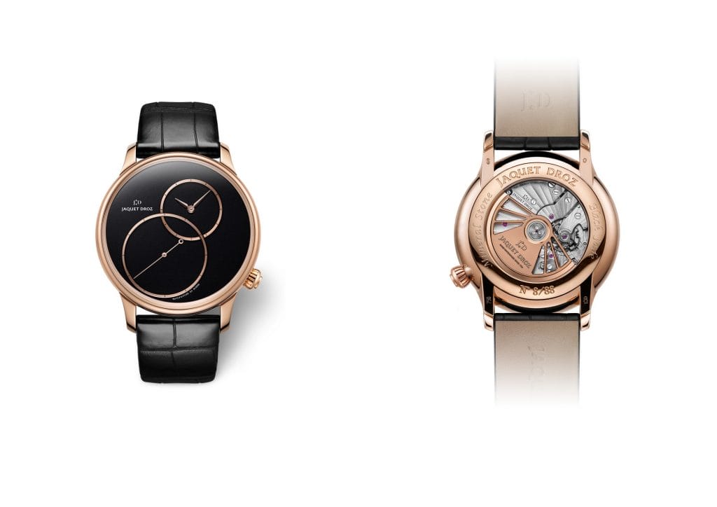 Aujourd’hui, le Jade Noir est au cœur de la nouvelle Grande Seconde Décentrée, en édition limitée à 88 exemplaires. Travaillé à la main telle une feuille minérale d’à peine 1 mm d’épaisseur, il se marie avec une boîte en or rouge aux reflets chauds et cuivrés. Les deux cercles et fines aiguilles sont également en or rouge, créant un singulier contraste qui reflète l’Art de l’Émerveillement de Jaquet Droz.