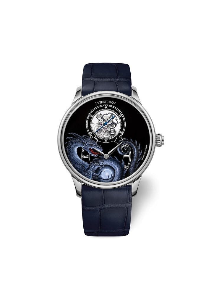 La représentation du dragon imaginé par John Howe se déploie sur la partie inférieure du cadran, également en or gris, recouvert d’un émail grand feu bleu nuit. Les artistes de la maison y ont peint à la main la créature dans des dégradés subtils de gris, lui conférant une impression saisissante de volume.