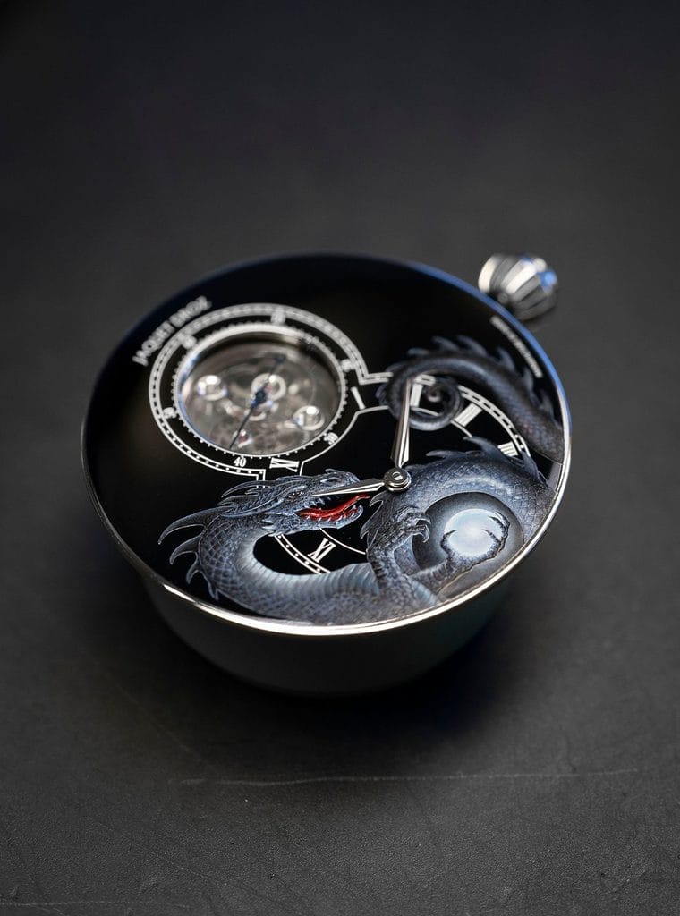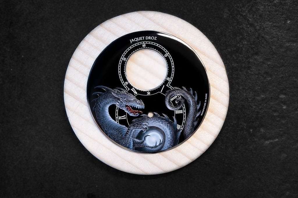 Deux défis majeurs ont été relevés par l’atelier : créer l’illusion que la perle tenue par le dragon émet une lumière propre, selon la volonté de l’artiste, et faire en sorte que le dragon semble surgir du cadran en passant au-dessus de la minuterie et des indications horaires, sans pour autant altérer la lisibilité des index, chiffres romains et chemin de fer. Ce travail minutieux a été réalisé avec des pinceaux si fins qu’ils ne comportent parfois qu’un seul poil.