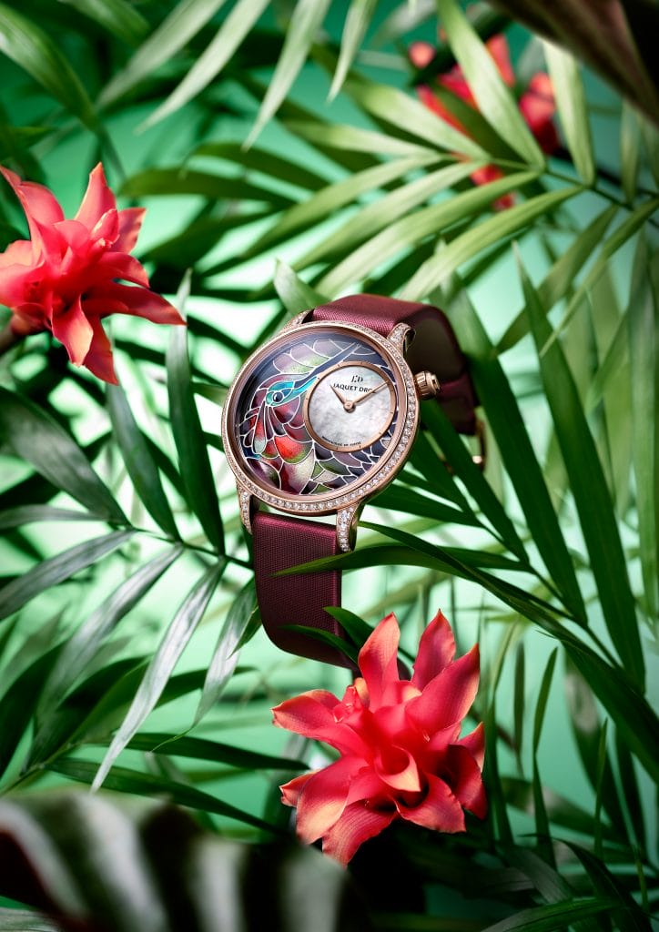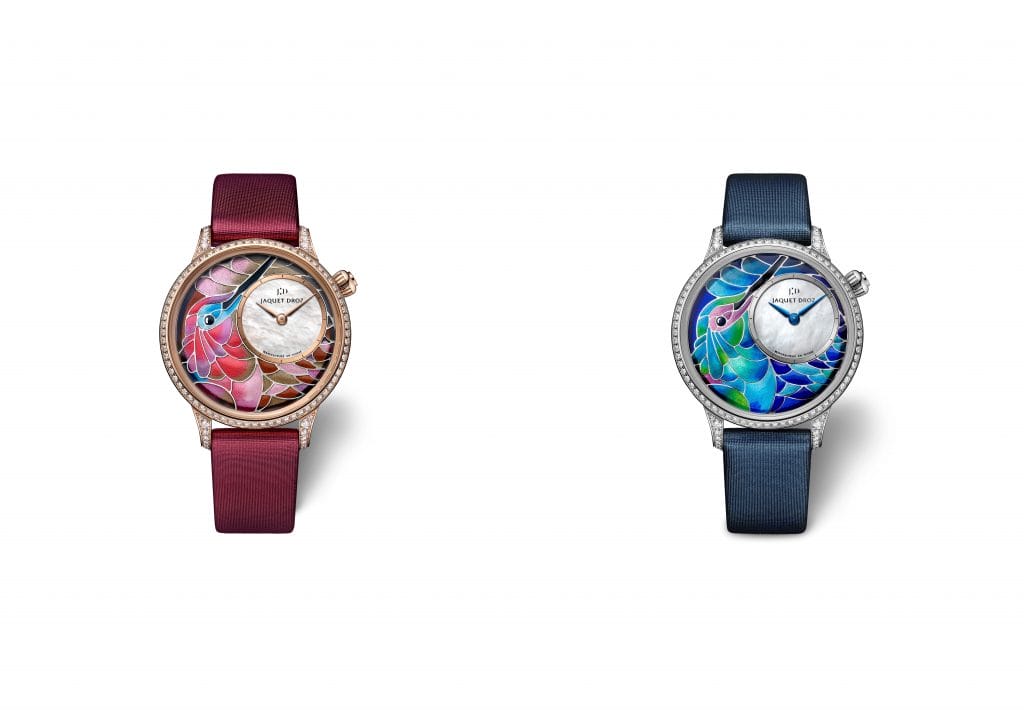 Offrant un spectacle des plus extraordinaires grâce à son plumage éclatant qui a la particularité de changer de couleur selon son orientation et de l’illumination, le colibri, que l’on retrouve dans la prestigieuse Tropical Bird Repeater, occupe la place centrale de cette composition. Deux oiseaux colorés ont été créés par les Ateliers d’Art Jaquet Droz pour lui donner vie. Dans le premier, des tons rose et bleu clair viennent en écho d’un cadran en nacre, au sein d’un boitier en or rouge serti de 100 diamants (0,89 carat). Dans le second, le colibri se pare de plumes vertes et turquoise sur un fond aux nuances de bleu. Le cadran en nacre, survolé de deux aiguilles en acier bleui, prend place au sein d’un boitier en or gris lui aussi serti de 100 diamants. Chaque modèle possède une masse oscillante en or ou platine gravée à la main et reprenant le motif du colibri. Les deux modèles, strictement limités à huit exemplaires chacun, sont portés par des bracelets en satin assortis aux tons dominants de chacune des créations. Traversées de lumière, elles rayonnent d’une lueur douce et diffuse illustrant la rareté et l’exclusivité des créations Jaquet Droz.