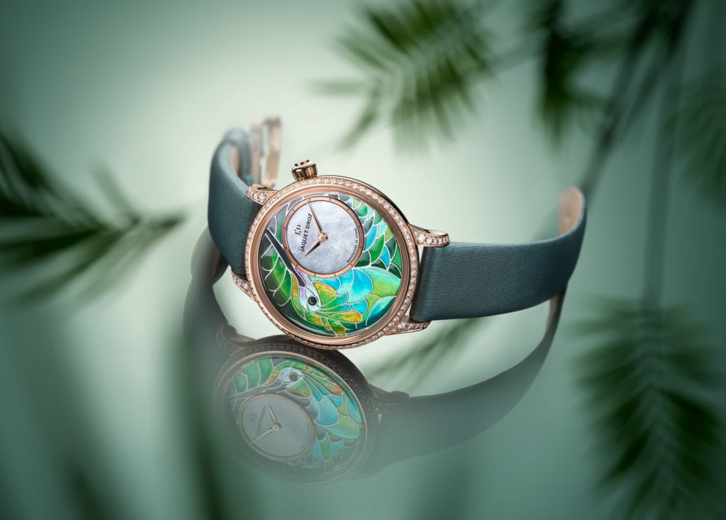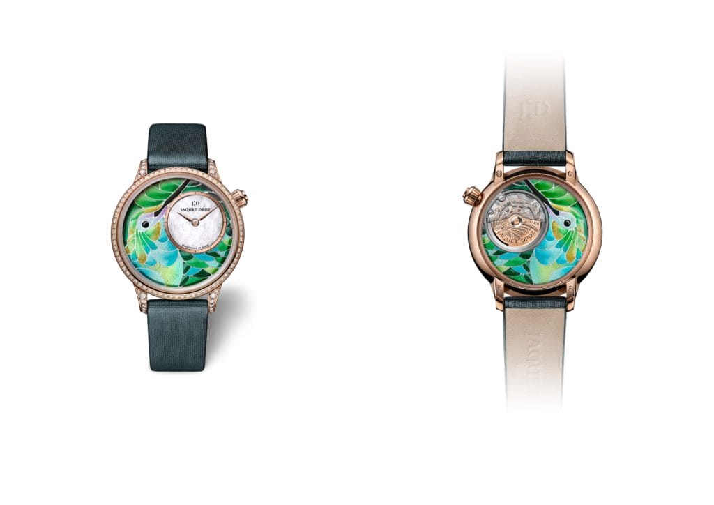 Ce motif, c’est aujourd’hui celui d’un colibri présenté en un subtil dégradé de vert. Jaquet Droz en a créé pas moins de sept nuances différentes pour exprimer sa vision estivale et joyeuse du célèbre oiseau. En choisissant comme cadre sa Petite Heure Minute à cadran décentré à 2 heures, la maison offre au colibri une vaste surface qui permet d’exprimer la richesse de ses tons et la virtuosité du plique-à-jour (smalta clara en latin).