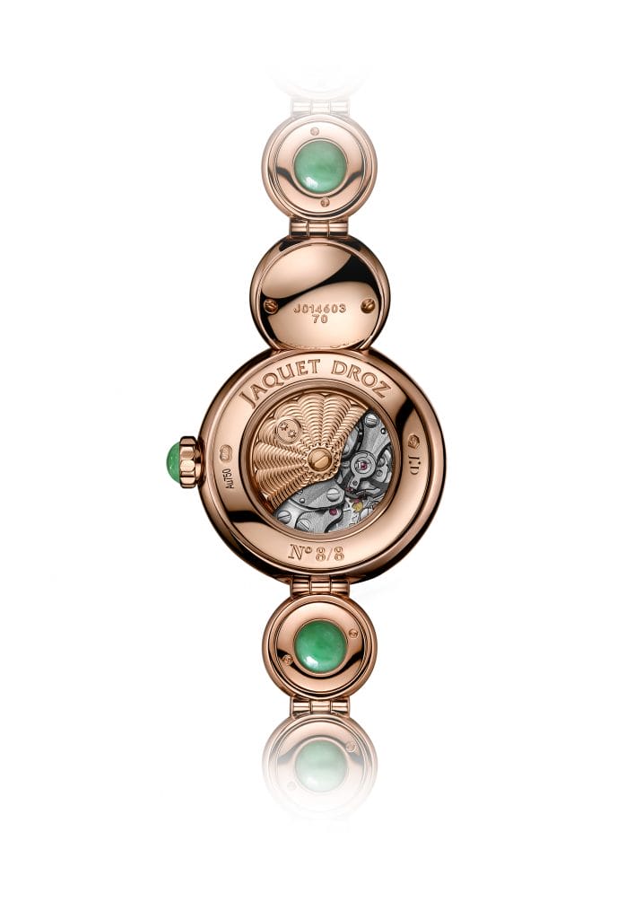 C’est de jade que s’habille le bracelet de la seconde version de la Lady 8 Petite en or rouge, valorisant la longue expérience de Jaquet Droz dans les compositions minérales les plus précieuses et exclusives. Cette version est d’ailleurs réalisée par la maison en numerus clausus, c’est-à-dire une version strictement limitée, ici à huit exemplaires. Son bracelet souple est entièrement serti et porte en son cœur des billes de jade d’un vert éclatant. Le choix de cette pierre ne doit rien au hasard. Protectrice, incarnant la sagesse acquise dans la sérénité, elle intensifie les sentiments amoureux et apporte l’harmonie. Ces dispositions naturelles, associées au dessin en « 8 » de la pièce qui évoque l’infini et l’éternité, confèrent à cette création de Haute Joaillerie une portée symbolique d’exception.