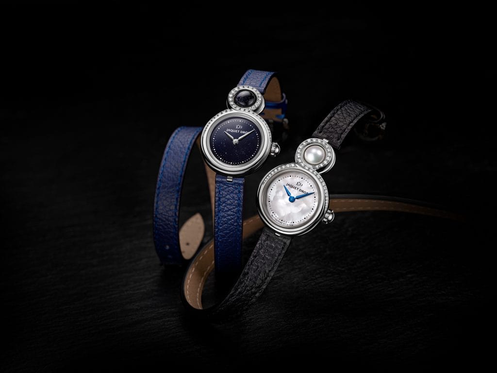Conçue comme une ode à la féminité et à l’élégance, la Lady 8 Petite préserve les attributs de son ainée : une création originale, dessinant le « 8 » emblématique de la maison, mariant les savoir-faire traditionnels de Jaquet Droz en terme de sertissage et de cadrans naturels. La délicatesse de sa boite qui ne comporte aucun angle, est accentuée par une glace bombée. A midi, une pierre assortie différemment selon les modèles tourne sur elle-même, roule sous le doigt, offrant l’illusion de pouvoir toucher du doigt le temps, sa préciosité.
