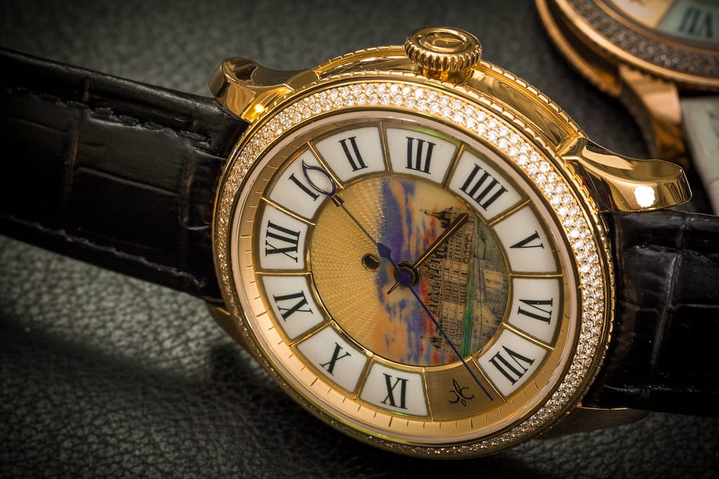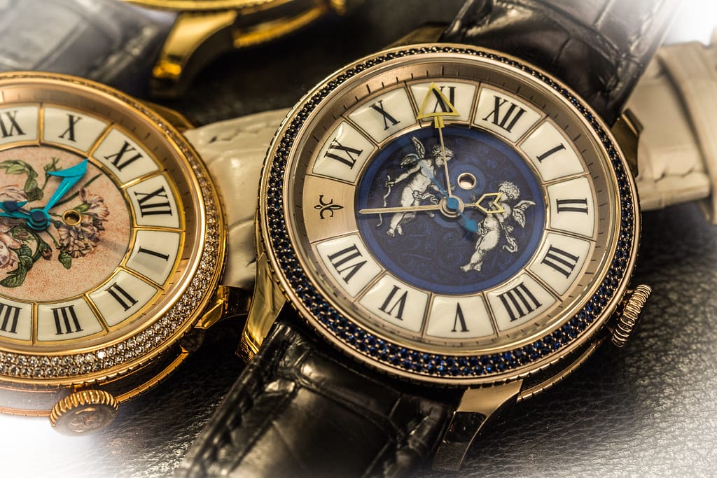 Mais il y a plus ! Compte tenu de l’exclusivité de ces pièces réalisées à l’unité et à la commande, toute latitude est donnée au futur bénéficiaire de demander une personnalisation de sa montre en joaillerie, gravure voire même peinture à la main selon la technique de la « miniature ». En voici un exemple ravissant en portrait à côté du modèle « Manufactura 1528 », l’autre ligne aujourd’hui proposée par l’équipe de Fabien Lamarche, en classique 3 aiguilles cette fois. L’indication 1528 pour, vous l’avez deviné, signifier qu’il y aura juste 28 exemplaires de chaque métal – et pas plus – réalisés par la manufacture !