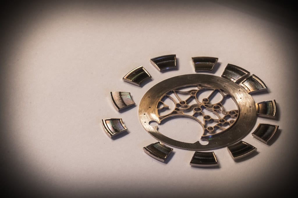 Un exemple parmi d’autres : l’une des spécificités de Julien Coudray est de réaliser les calibres de ses modèles dans le même métal que la boîte, que ce soit pour l’or … mais aussi pour le platine, si difficile à travailler et à orner. Il a fallu à Bruno Karbiche et ses collègues plusieurs années pour résoudre les difficultés posées et mettre au point les outils qui permettent aujourd’hui d’atteindre la quasi-perfection illustrée ici sur les pièces du modèle « Competentia 1515 » avec ses gravures à la main comme le perlage et le guillochage de ses éléments cachés.