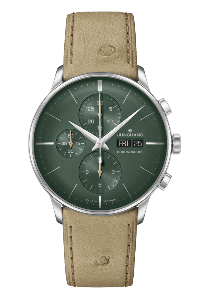 La Meister Chronoscope réunit, avec conviction, différents éléments complémentaires afin de former une pièce unique et harmonieuse. La face avant du garde-temps se distingue par son cadran bombé. Ce dernier, grâce à la finesse de son polissage circulaire et sa structure en trois dimensions, resplendit dans différentes nuances de vert en fonction de la lumière. Avec des teintes allant d’un chaleureux vert sapin à un vert foncé mystérieux, la palette de couleurs du cadran évoque également la Forêt-Noire, la région d’origine de Junghans. Les compteurs totalisateurs concaves enchâssés et leurs aiguilles aux couleurs contrastées accentuent encore davantage l’allure sportive du garde-temps.
