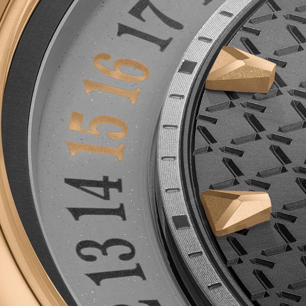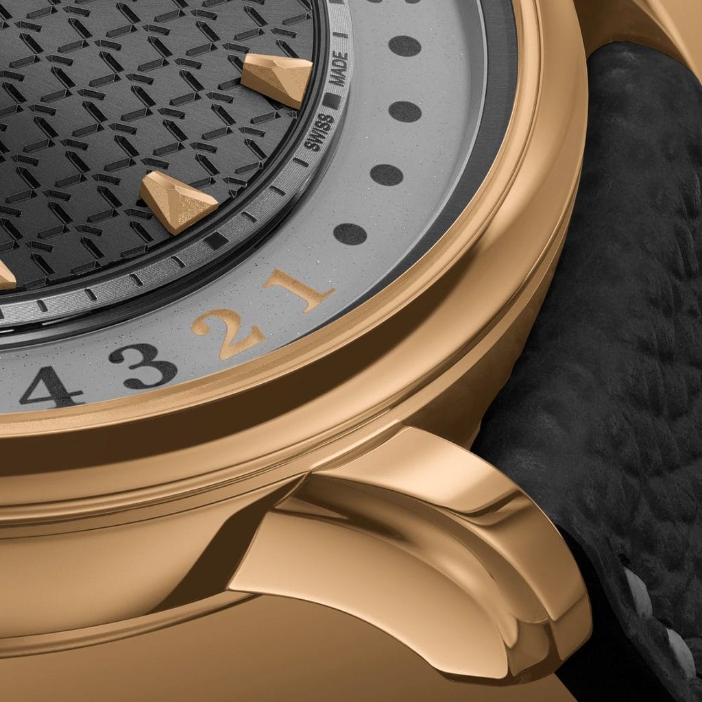 Dans cette version en or rose, la palette gris anthracite du cadran renforce la lisibilité du calendrier grâce à un jeu de contrastes plus marqué. Le mois s’organise selon un rythme visuel clair, grâce à deux disques superposés peints à la main par André Martinez, artisan installé à Le Locle : les jours de semaine apparaissent dans une teinte anthracite, tandis que les week-ends sont indiqués en or. Cette alternance crée un rythme intuitif de cinq jours ouvrés suivis de deux jours de repos, générant une composition équilibrée autour du cadran.
