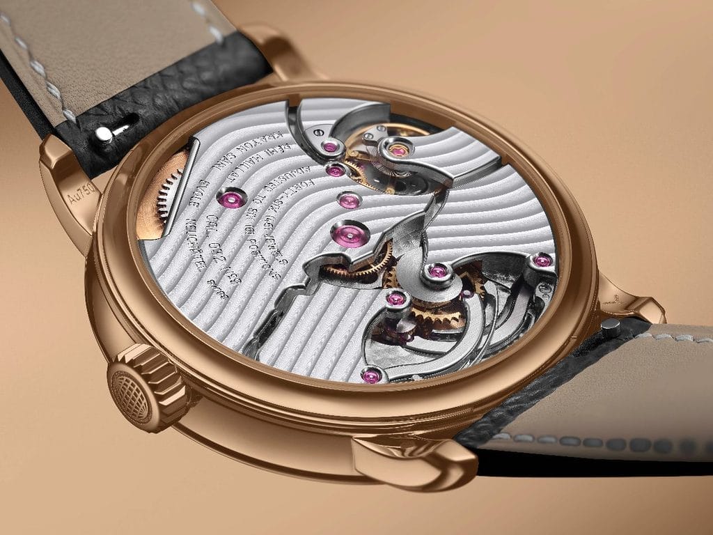 La montre présente également des finitions de haut niveau : chanfreins nets et angles rentrants, ponts dont les contours internes évoquent les rives du lac de Neuchâtel, platine principale animée du motif des vagues Krayon, ainsi qu’un cadran guilloché dont le motif en « Y » constitue l’une des signatures esthétiques de la marque.