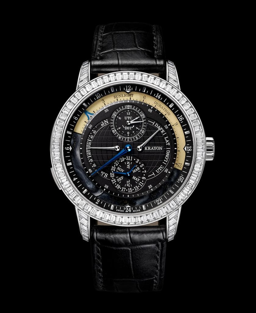 Sur terre comme sur mer, la course du Soleil dans le ciel fonde la notion du temps qui passe et permet même de le mesurer. La démarche des ingénieurs de Krayon est née d’un rêve : pouvoir lire l’heure réelle de lever et de coucher du Soleil en tout point du globe grâce à un mouvement mécanique. Ils réussissent ainsi un nouveau défi encore jamais réalisé en horlogerie, un calculateur mécanique universel de l’heure exacte de lever et de coucher du Soleil.