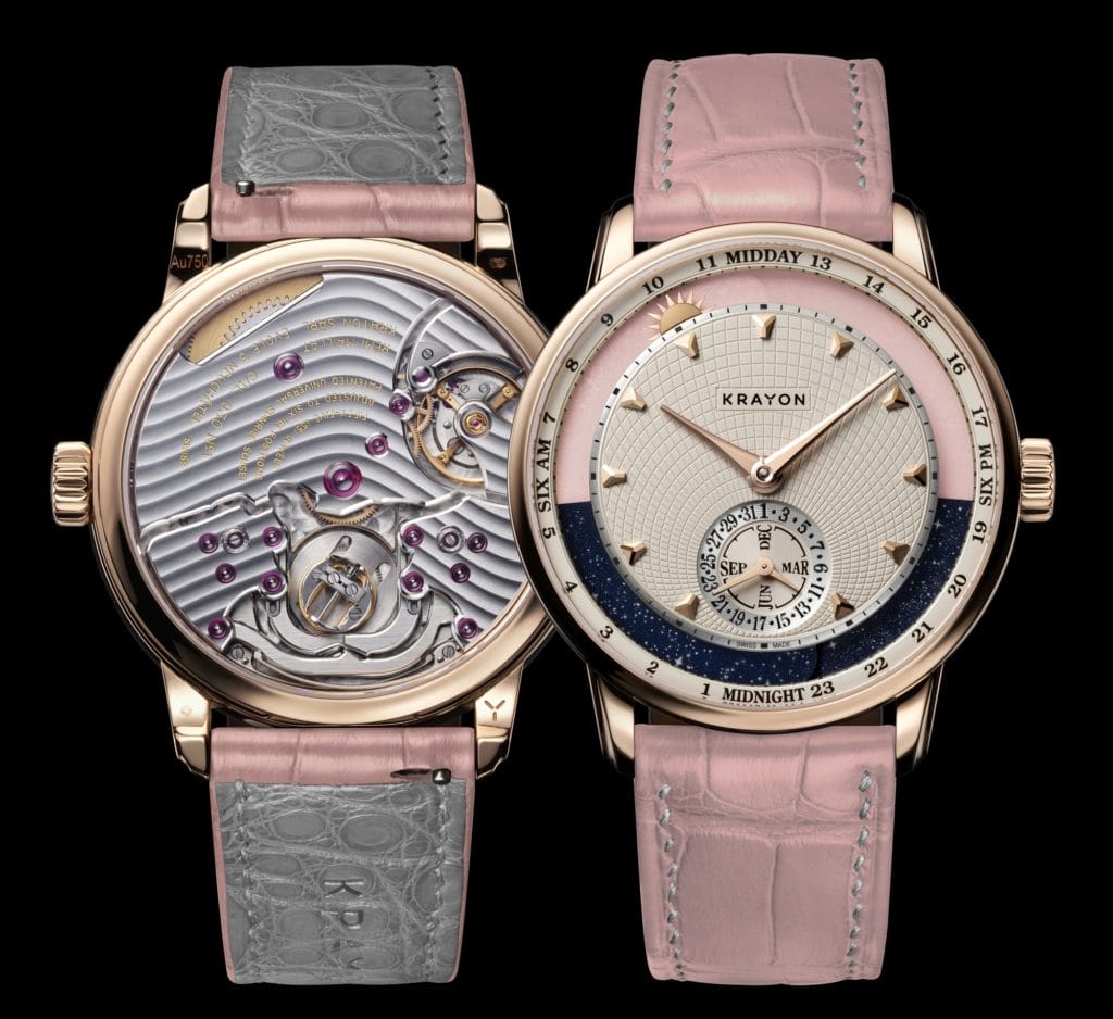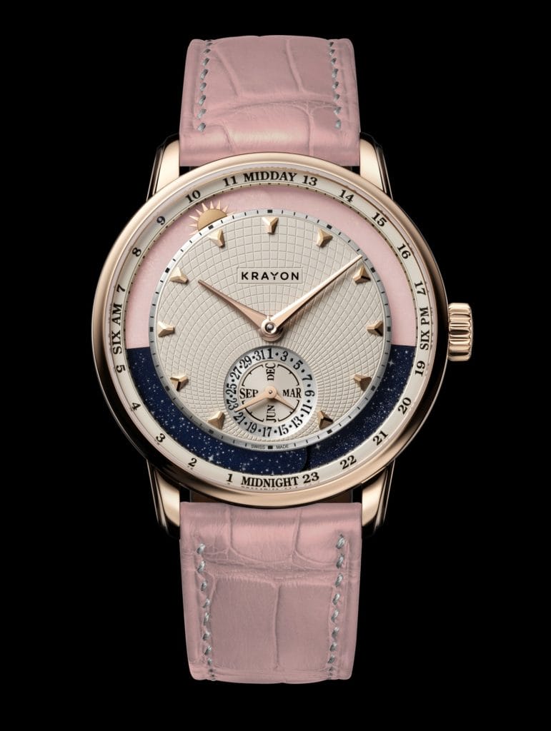Le temps est ressenti de manière personnelle. Mais il est avant tout pour les horlogers une dimension de l’espace qui se mesure de manière objective. Krayon réinterprète sa complication fétiche dans un éphéméride sur-mesure au féminin – Lady Anywhere – qui unit ces deux faces à travers la complication qui est sa raison d’être : cet instant presque magique, poétique, où le jour et la nuit basculent de l’un à l’autre, l’heure du lever du soleil, et celle du coucher du soleil.