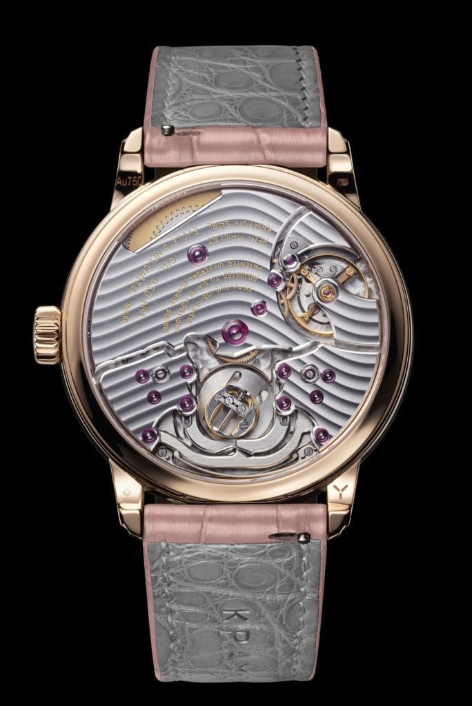 Le calibre de Lady Anywhere a été lui aussi minutieusement développé et assemblé par Rémi Maillat, horloger fondateur de Krayon. Il s’agit d’un mouvement dédié et pensé en 2020, qui offre 86 heures de marche. Il est large, pour accueillir les disques de jour et de nuit, mais surtout d’une épaisseur très limitée au regard de sa complexité. Avec seulement 5 mm, il autorise l’épaisseur de boîte de seulement 9 mm.