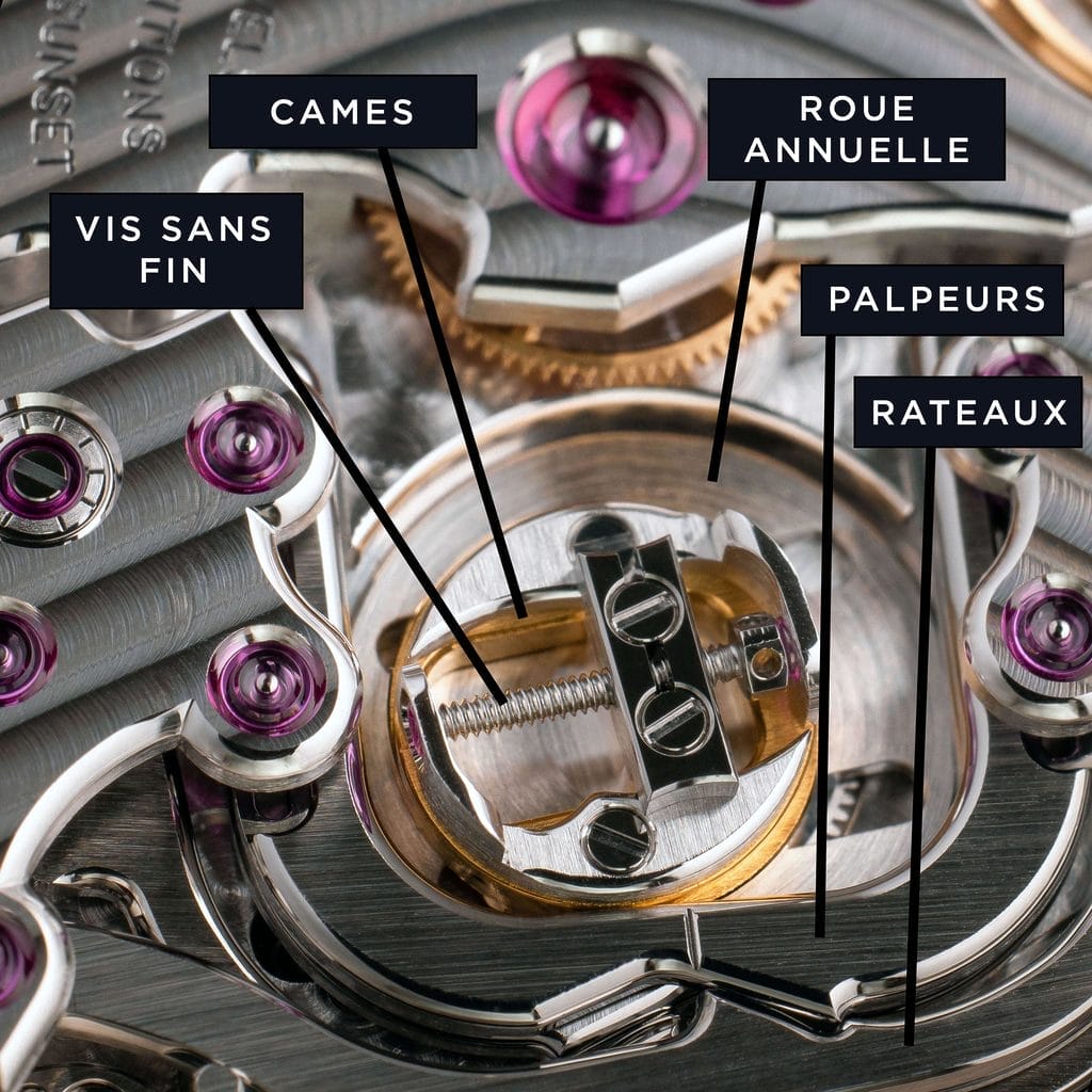Le cœur du mécanisme, visible entre deux ponts, permet d’observer son fonctionnement. A l’intérieur de la montre : en lieu et place d’une seule came, l’ingénierie de Krayon réside dans deux cames qui travaillent ensemble et qui n’ont plus besoin d’être changées.