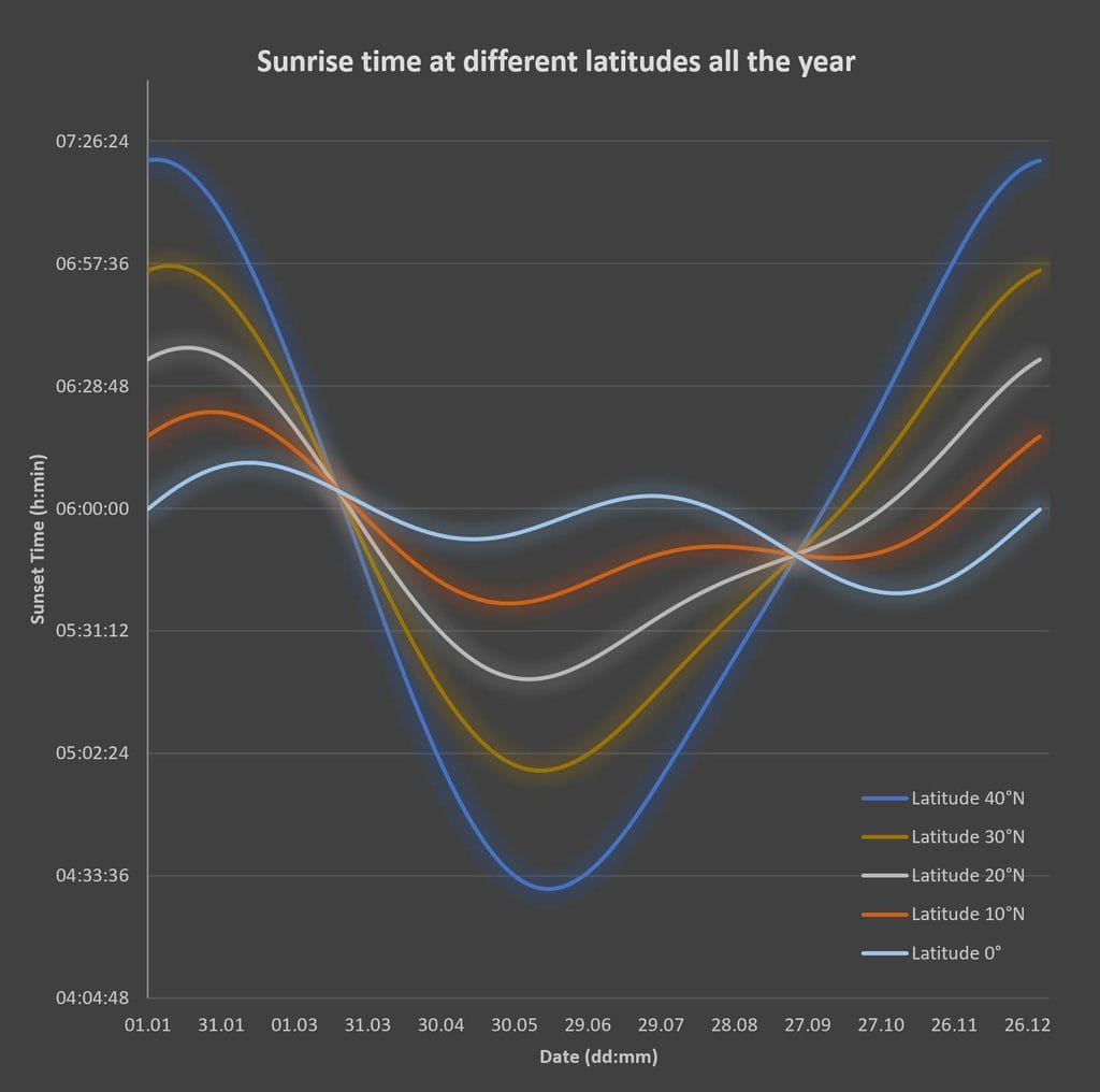 Comme chacun d’entre nous le sait, les heures de lever et de coucher du soleil varient en fonction de cinq paramètres :