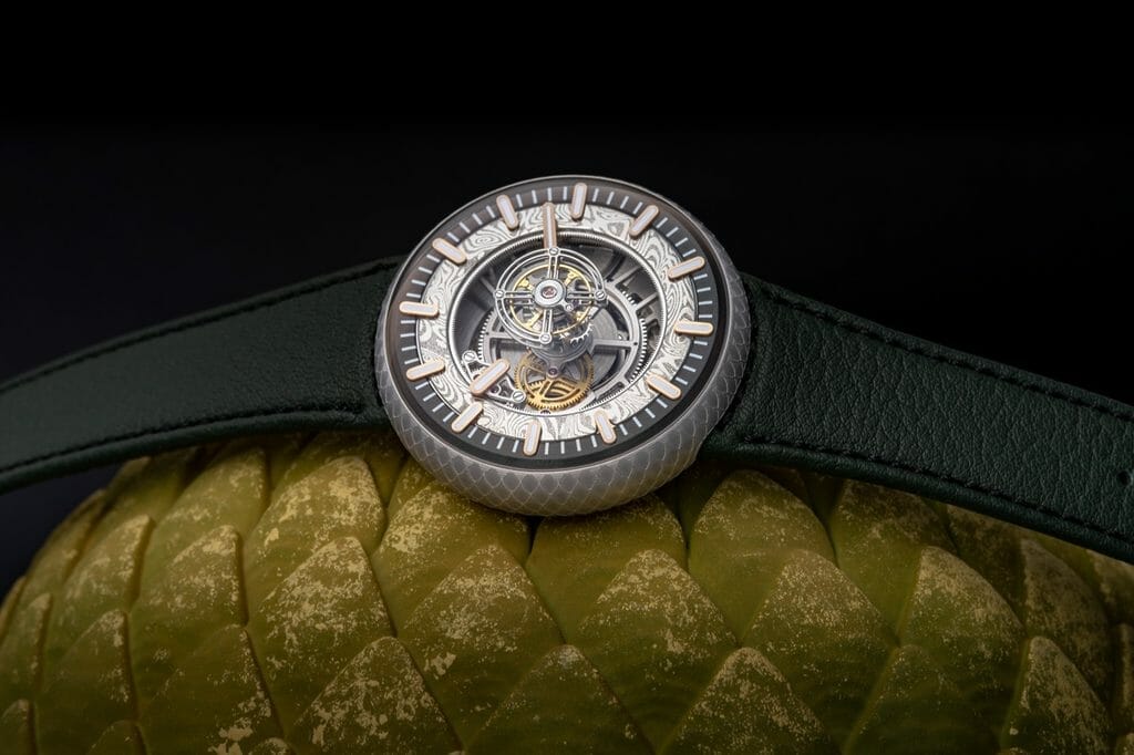 Kross Studio a travaillé avec la même fonderie qui a forgé le métal pour les épées de la série HBO afin de créer l’acier de Damas utilisé pour le cadran du GOT Dragon Central Tourbillon, afin d’être aussi proche que possible de l’univers imaginé. Les fans reconnaîtront immédiatement l’aspect strié du cadran, composé de multiples couches sombres et scintillantes.