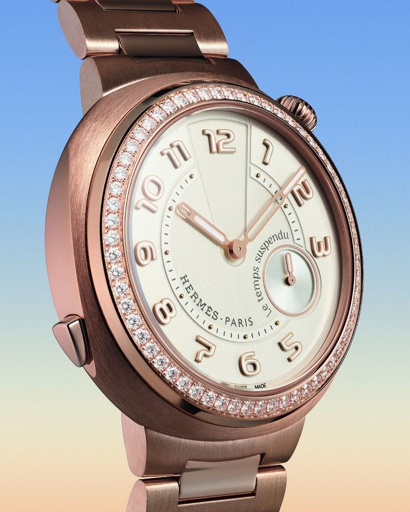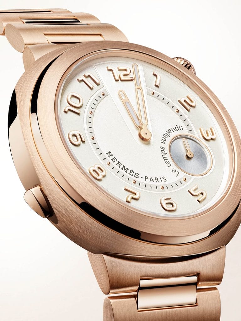 Créé en 2011, « Le temps suspendu » illustre l’approche ludique d’Hermès vis-à-vis du temps. Cette vision propose un temps complice, libre des conventions, pour mieux célébrer le présent. En cultivant le paradoxe selon lequel le temps que l’on oublie est souvent celui que l’on chérit, Hermès revisite en 2025 cette complication sur le modèle Arceau et l’introduit pour la première fois dans la collection Hermès Cut.