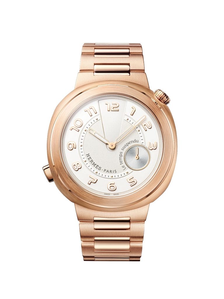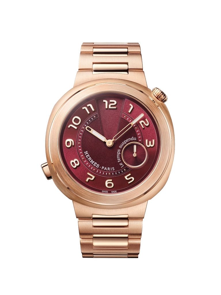 La collection Hermès Cut, lancée en 2024, accueille désormais cette complication iconique. Son boîtier en or rose de 39 mm, aux lignes affirmées et à la géométrie audacieuse, abrite le module « Le temps suspendu » associé au mouvement Hermès H1912. Le témoin de marche à rotation anti-horaire renforce son caractère décalé. Plusieurs versions sont proposées, dont une édition limitée avec cadran rouge, offrant une vision singulière et créative du temps.