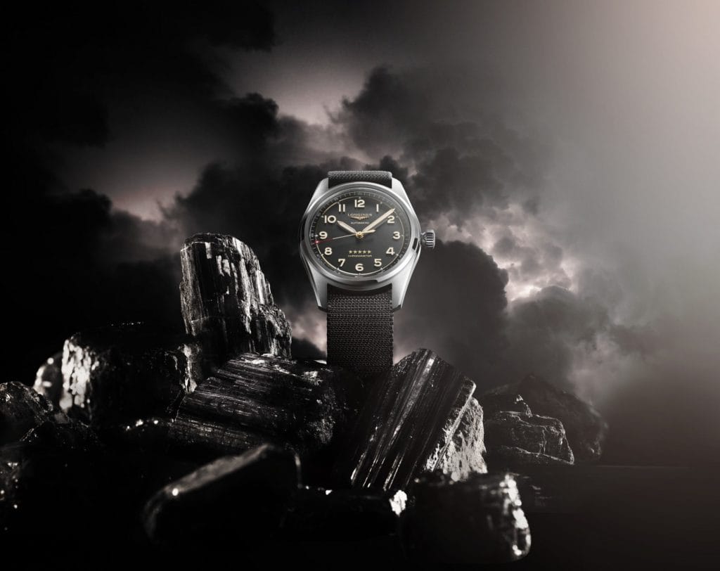 Comme pour rappeler qu’elle est issue de la roche, la Longines Spirit joue des contrastes entre nuances obscures et brillance subtile. Aiguilles, chiffres, étoiles et sablier présentent les reflets tamisés d’un or adouci (1N), exprimant l’équilibre parfait des tons et des matières – un équilibre étayé par l’absence de guichet date, qui renforce encore la symétrie aéronautique de la montre.