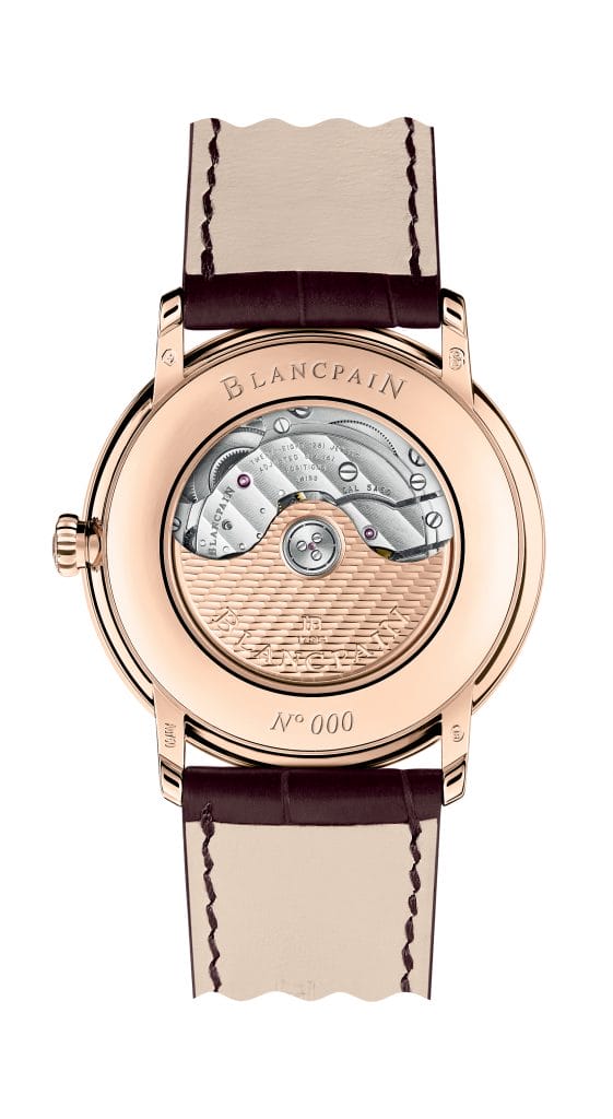 La nouvelle Villeret GMT Date est animée par le mouvement automatique 5A50, entièrement conçu et réalisé dans les ateliers de la Manufacture, comme cela est de rigueur chez Blancpain. Ce mécanisme, qui bénéficie des derniers développements techniques de la marque, est doté d’une réserve de marche de quatre jours et d’un spiral en silicium. Côté finitions, un fond en saphir laisse admirer des côtes de Genève sur les ponts et un motif nid d’abeille sur la masse oscillante, qui est en or.