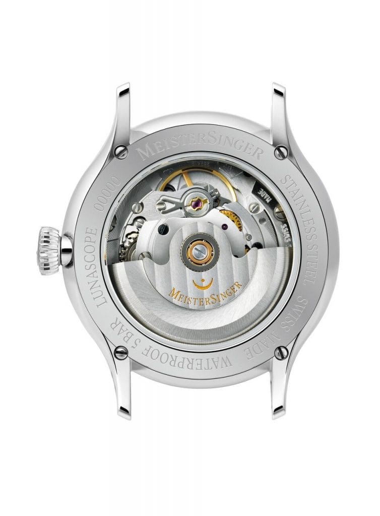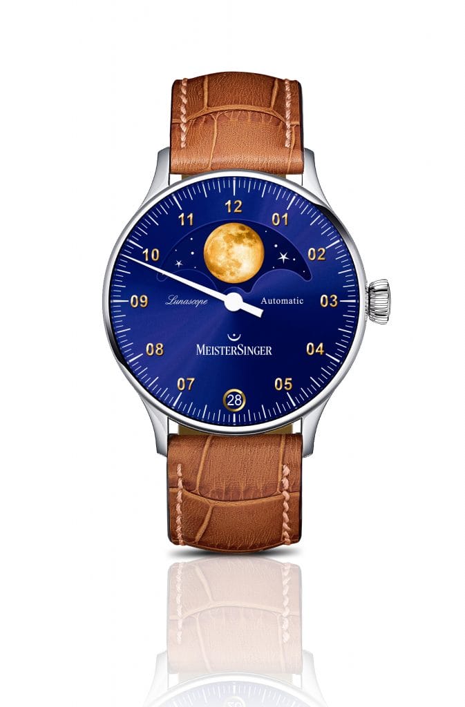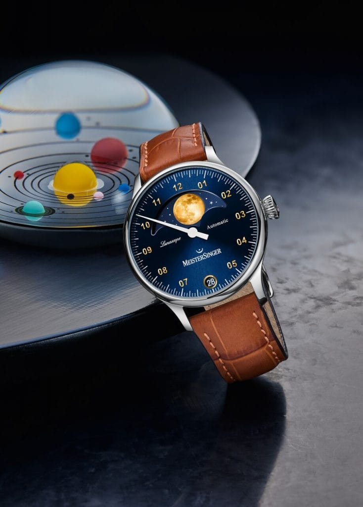 Le module, créé spécifiquement pour la MeisterSinger Lunascope Golden Moon, est de loin plus exact. A l’image des montres haut de gamme, il est équipé d’un système très complexe. Dénommé « lune astronomique », il réduit l’écart entre le mécanisme et le véritable cycle lunaire d’un seul jour en 122 ans ! Une courte période en astronomie mais un temps très long en horlogerie…